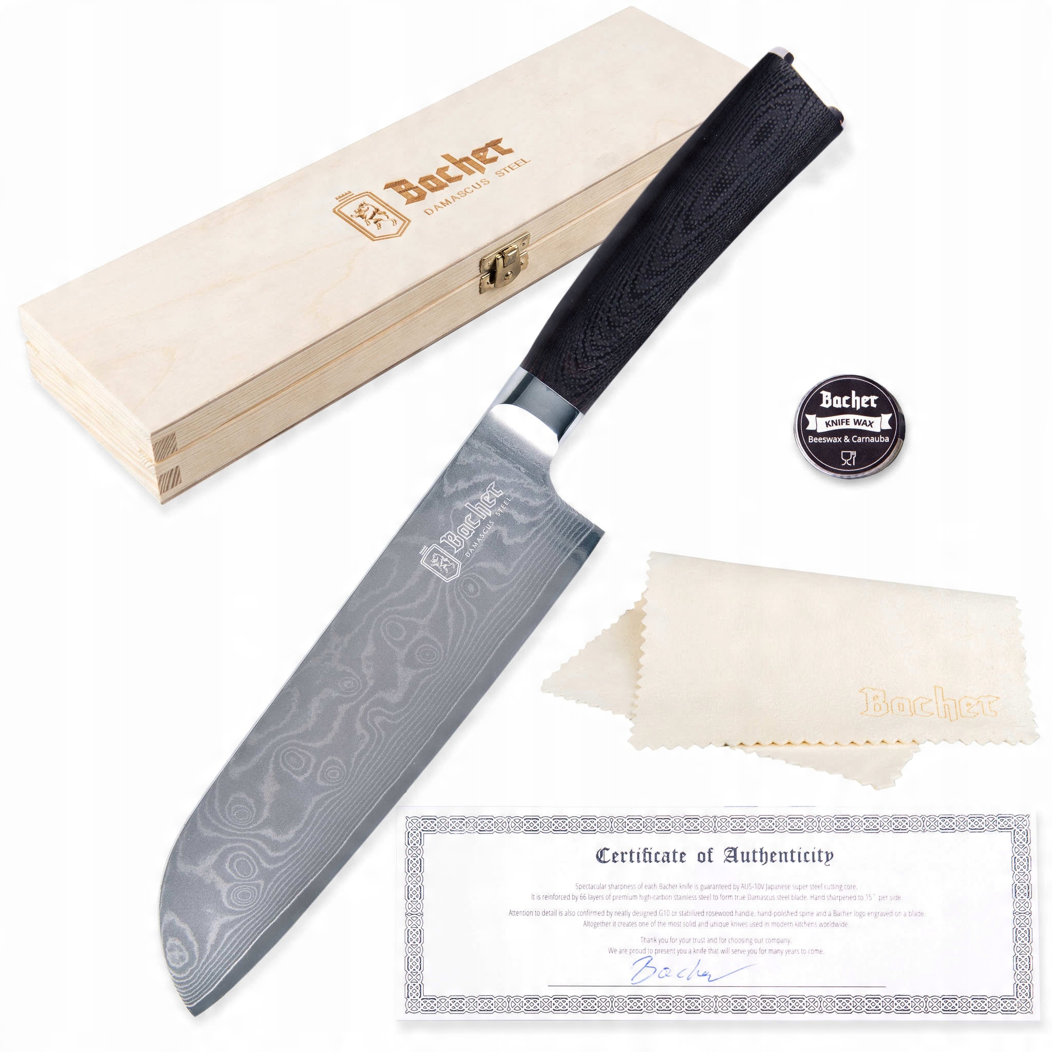 Ніж кухонний BACHER Santoku з японської дамаської сталі AUS-10V - подарунковий набір в дерев'яній коробці - чорний