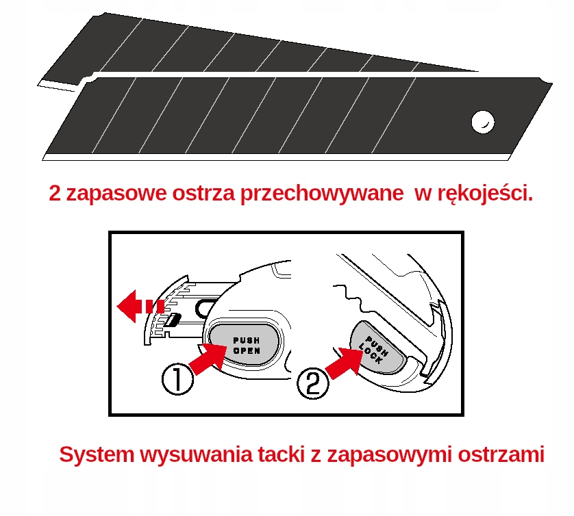 Ніж покритий резиb>на, що не дає йому вислизати з руки. Тримач страхувального троса запобігає падінню ножа, що особливо корисно при роботі на висоті. У набір входять три леза EVO Power Black, які зберігаються в тримачі. Металева направляюча леза у формі пащі акули забезпечує верхнє захоплення леза, зберігаючи при цьому довшу ріжучу поверхню. Форма, дизайн і легкість ножа дозволяють довго працювати, зберігаючи безпеку і довговічність.