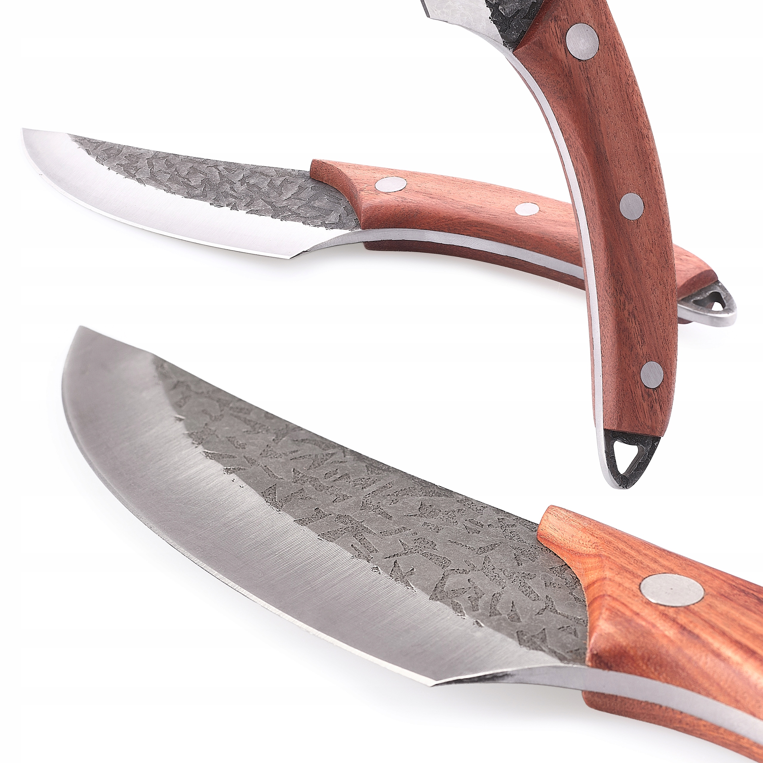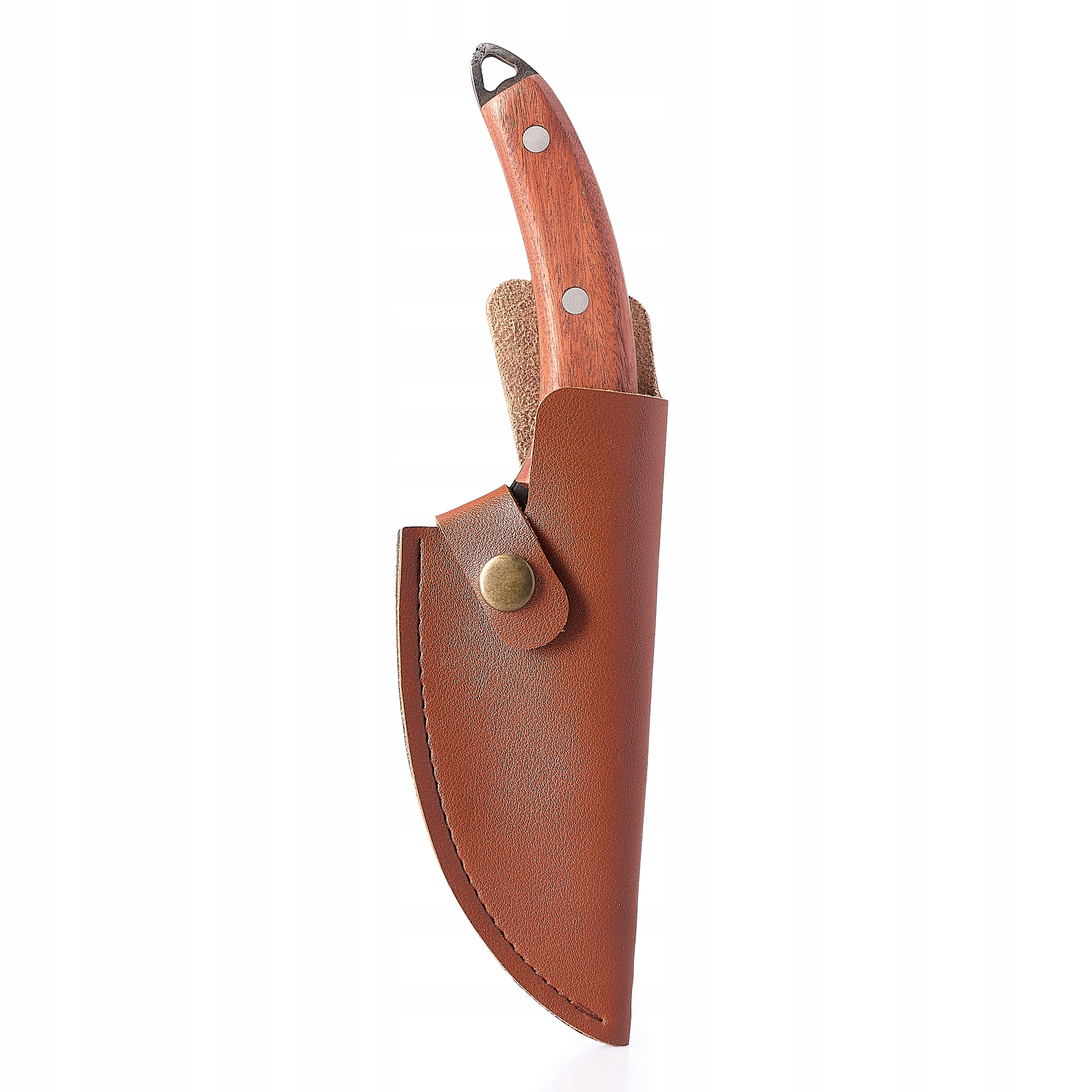 Кухонний ніж з лезом ручної обробки твердістю HRC 55, міцною дерев'яною ручкою та елегантним шкіряним чохлом. Ідеально підходить для кухні, багаття, барбекю - і як подарунок.
