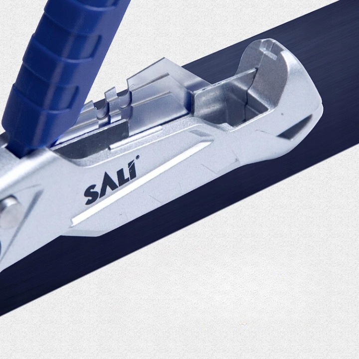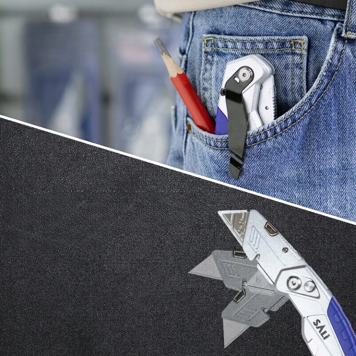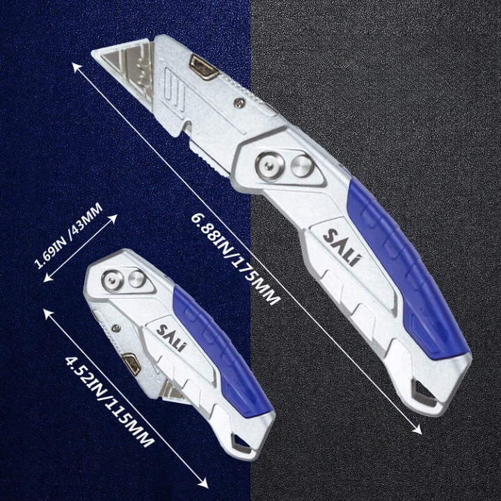 Складний ніж зі змінними лезами SALI, зручно складається одним натисканням кнопки. Конструкція фіксатора надійно фіксує лезо на місці під час використання. Швидкозмінний механізм для легкого видалення леза. Призначений спеціально для різання картону, шпалер, килимів, брезенту, фольги для друку та ПВХ-плівки тощо.