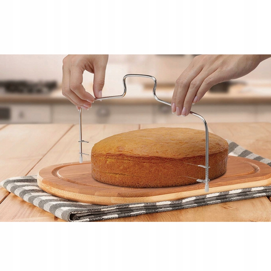 Ніж має дві регульовані струни для нарізання коржів різної товщини. Катер полегшує нарізку пластів бісквіта різної товщини. Все, що вам потрібно зробити, це встановити потрібну висоту і розрізати бісквіт. Завдяки цьому гаджету ви завжди будете розрізати бісквіт рівно і без пошкоджених країв. Не чекайте більше і КУПУЙТЕ ЗАРАЗ !