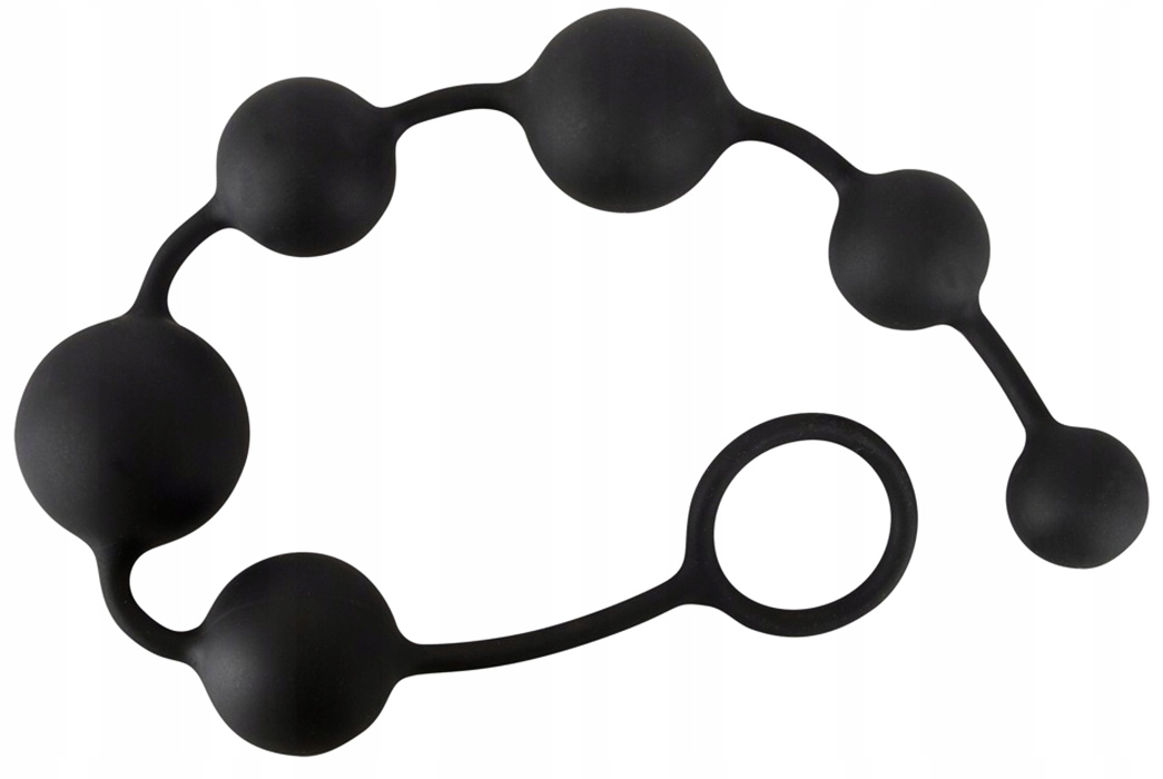 Чорний ланцюжок з кульками з шістьма кульками різного діаметру ( 2,3-3,9 см). Легко розтягується. Зі зворотним кільцем. Загальна довжина приблизно 40 см. Матеріал: силікон.
