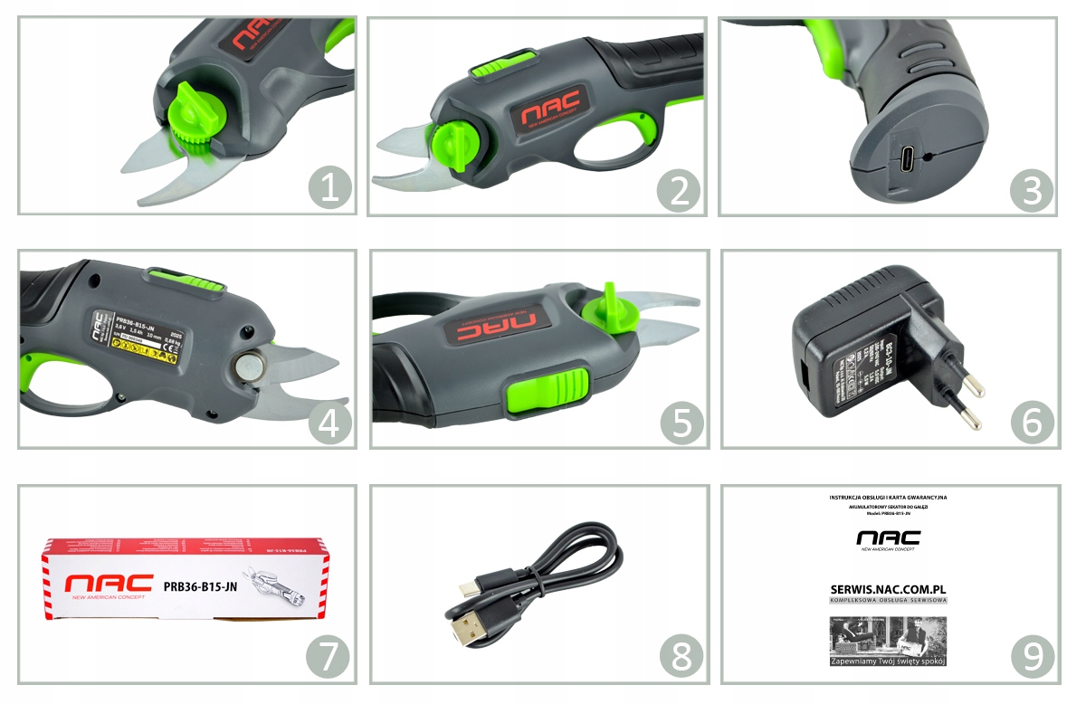 обрізки акумуляторів для різання гілок та чагарників авторитетної компанії NAC із символом PRB36-B15-JN, що працює від акумулятора з напругою 3,6 В і ємністю 1500 мАг.