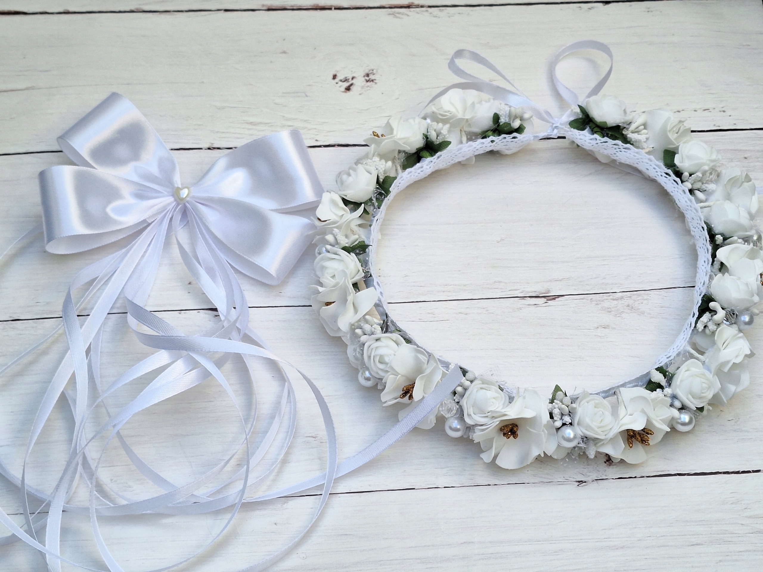 Віночок виготовлено з пінопластових троянд і квітів ручної роботи, перлів з діамантами та квіткових аксесуарів. Квіти виглядають дуже реалістично, завдяки чому дівчина виглядає ніжною та елегантною в день Святого Причастя.