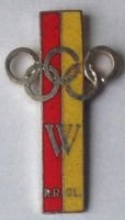 умова: добре кріплення: pin Матеріал: Емаль Опис: знаки нижнього Сілезійського олімпійського клубу. На прямокутному, вертикальному червоно-жовтому поясі, п'яти срібних олімпійських колесах, нижче срібної літери W, нижче напису: RR-OL (густі колеса). Рік виробництва: До 1976 року, позолочений.