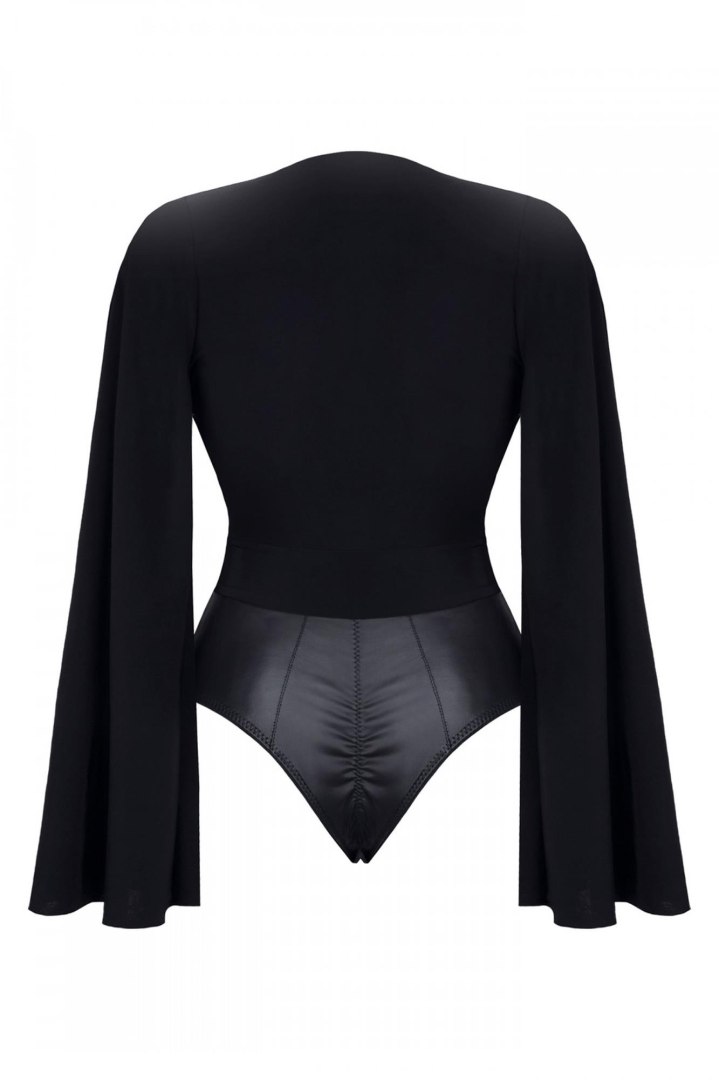 4 Унікальне тіло зображення з довгими розпростертими руками та інтригуюче глибоким декольте. Він був виготовлений з 2 різних матеріалів. Гора від м'якої, благородної і дуже приємної до дотичної чорної тканини. Це прекрасно йде на тіло і дуже приємно на дотик. Вниз з чорного, гнучкого вет -глядаць. На спині вертикальне зшивання використовувалося злегка п’яним матеріалом.