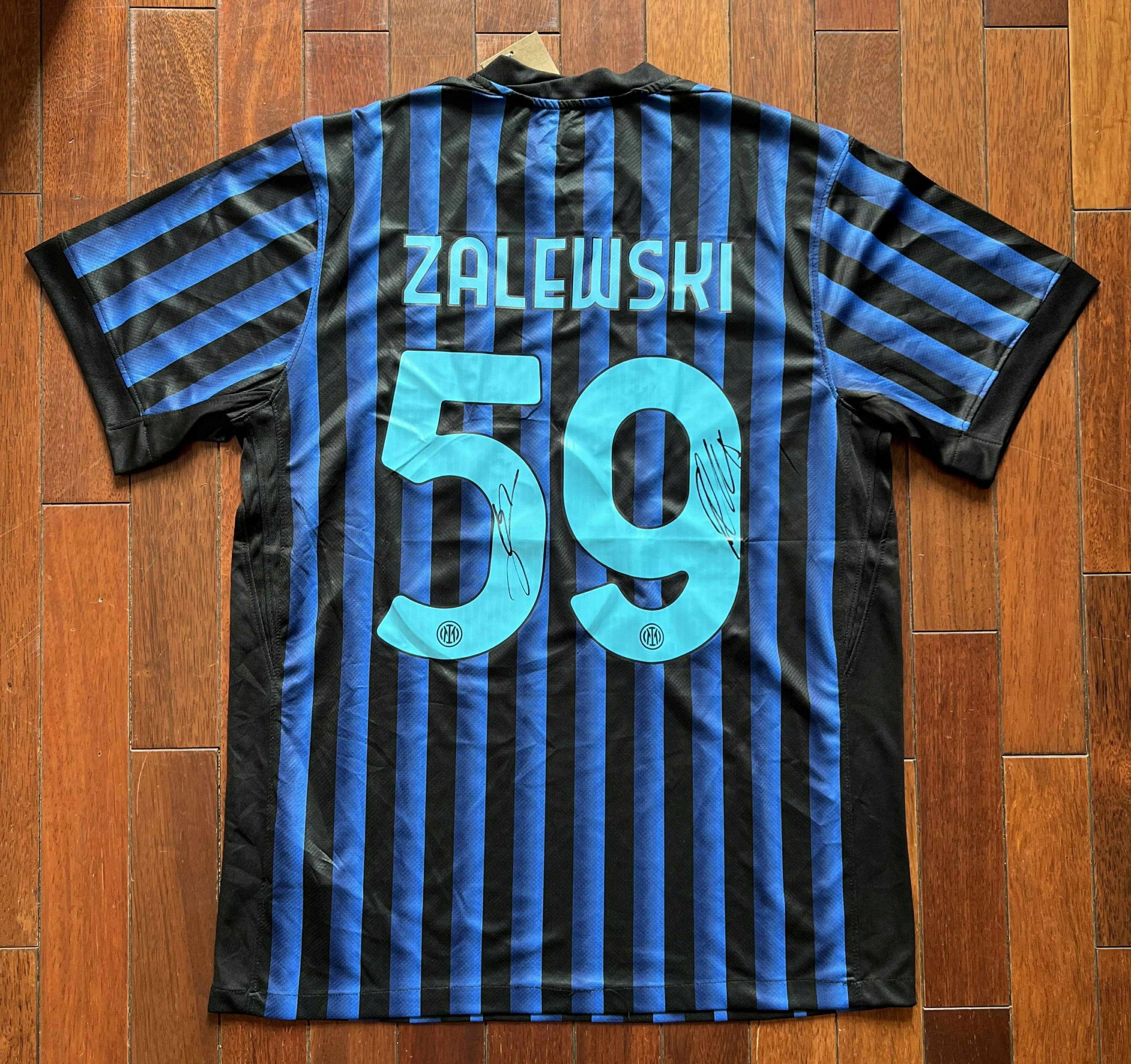 t -сорочка з № 59 між Міланом з автографом Нікола Залевського та Піотр Зеліьї. Унікальна позиція для футбольних фанатів. Включає сертифікат автентичності у вигляді наклейки QR -коду, виданого авторитетною американською компанією.