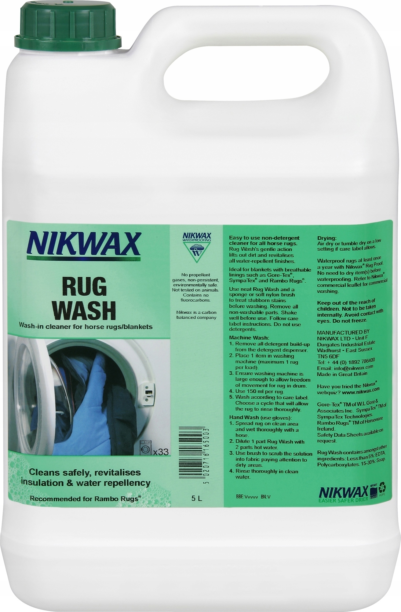 Nikwax Rug Wash™ — це безпечний спосіб ретельного очищення водонепроникних килимків і килимків для домашніх тварин, оптимізуючи їх ефективність і подовжуючи термін служби. Застосування засобу в пральній машині відбувається швидко, легко та забезпечує ретельне очищення всього килима.