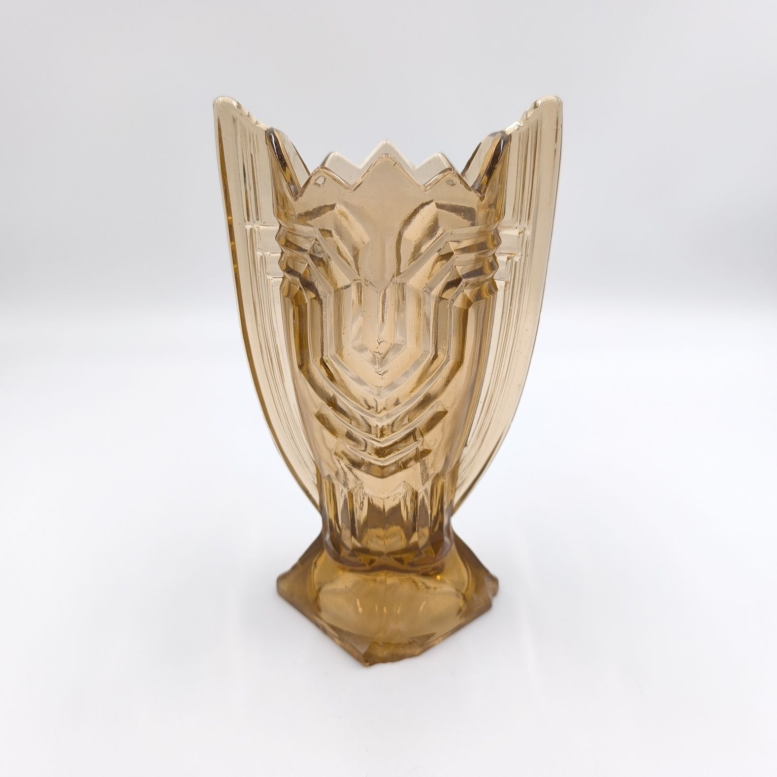 Ваза в стилі ар-деко з характерною геометричною формою та симетричними складними лініями. Ваза виглядає надзвичайно елегантно і декоративно. Товсте скло і точні, ритмічні канавки підкреслюють його стильний характер і гру світла на поверхні. Ідеально підходить як самостійна прикраса інтер’єру, так і для демонстрації окремих квітів. Він ідеально вписується в естетику 1930-х років, поєднуючи функціональність із декоративною елегантністю.