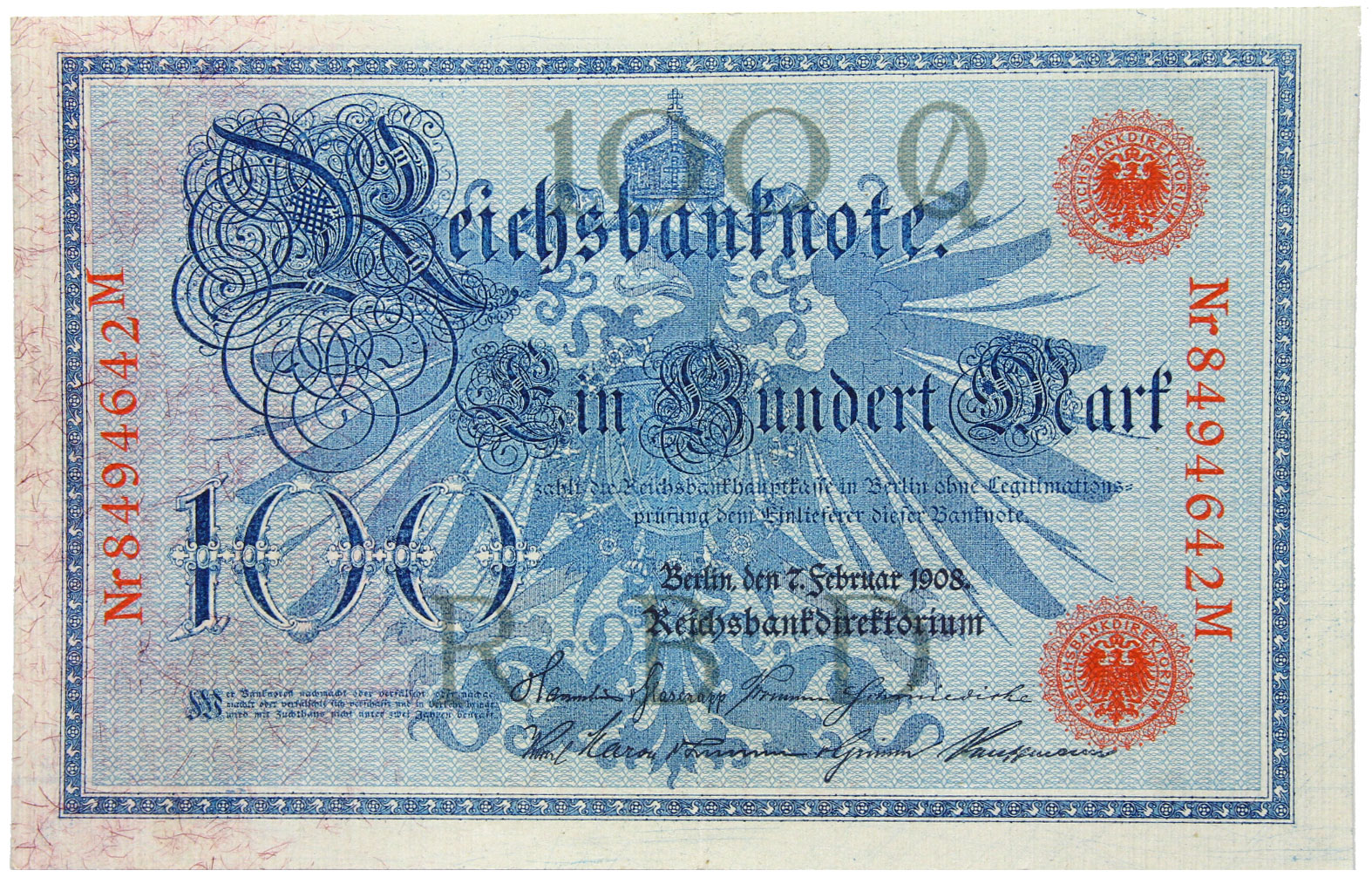 Німеччина-банкнота-100 марок 1908 червоний друк
