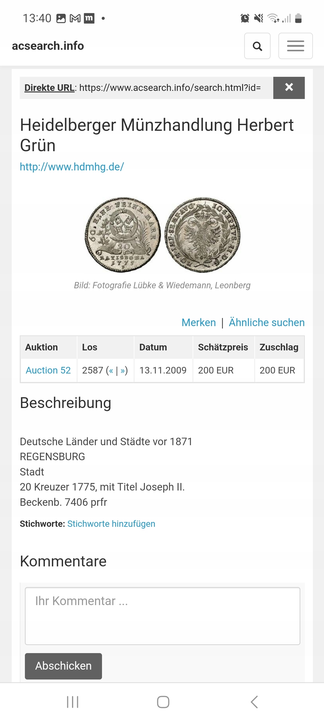 Німеччина, Регенсбург (Regensburg), 20 крейцерів 1775 р. з титулом Йосифа II, срібло, 6,62 г, 28,5-28,6 мм.