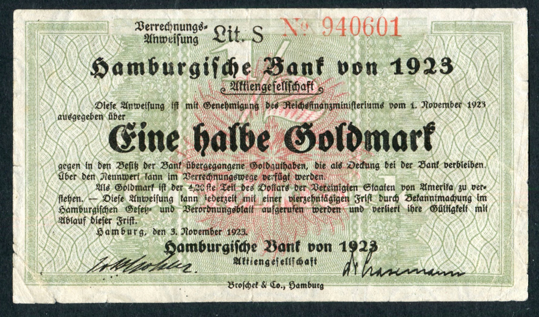 Німеччина Гамбург 1/2 золотої марки 1923 р. 3-/3