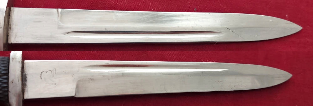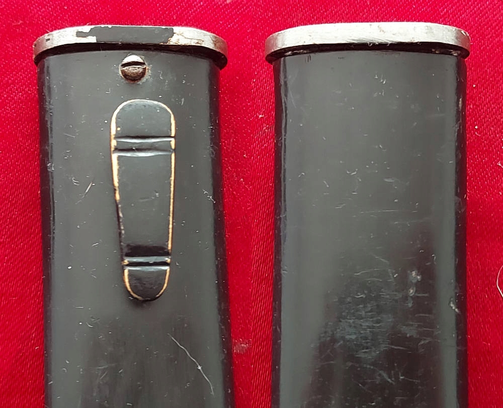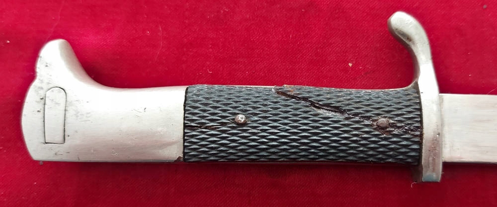 Копія, видна на доданих фотографіях, дуже добре збережена. Лезо не зазначено і нефарбоване, збережене практично повністю оригінальний хром. На порозі леза, видимий підпис, пожежний шолом - рідкісний. Обшивка оригінальна, виготовлена з пластику. Одна облицювання була відремонтована, вона має поздовжню тріщину. Замок Bayonet функціональний.