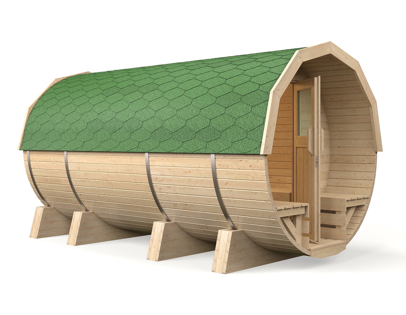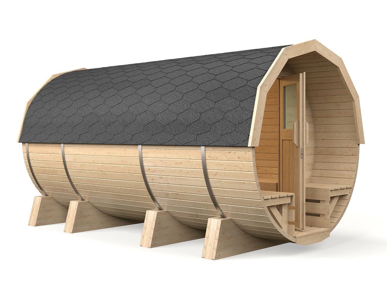 Масивна, стійка і міцна конструкція, товщина стінок : 44 мм, висушена деревина нордичної ялини, зі здоровими сучками, згладжена та скошена, спеціально відфрезерована для отримання оптимально круглих стінок бочки Передня та задня стінки виготовлені з товстих дощок з подвійним шпунтом і пазом Масивні стінки посилені регульованими ременями з нержавіючої сталі Внутрішні лави з осики.Всі шурупи нержавіючі.Покрівля з підкладковим утеплювачем та бітумним кутником.Міжкімнатні двері з товстого загартованого скла з дерев’яними ручками.Зовнішні клеєні дерев’яні двері з ізоляційним склом, що відкриваються назовні.