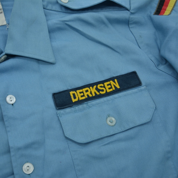 Оригінальна синя сорочка з ресурсів німецької армії. Сорочка оснащена двома кишенями на висоті грудей, які застібаються на гудзики. Манжети застібаються на гудзики, на плечах німецькі прапори.