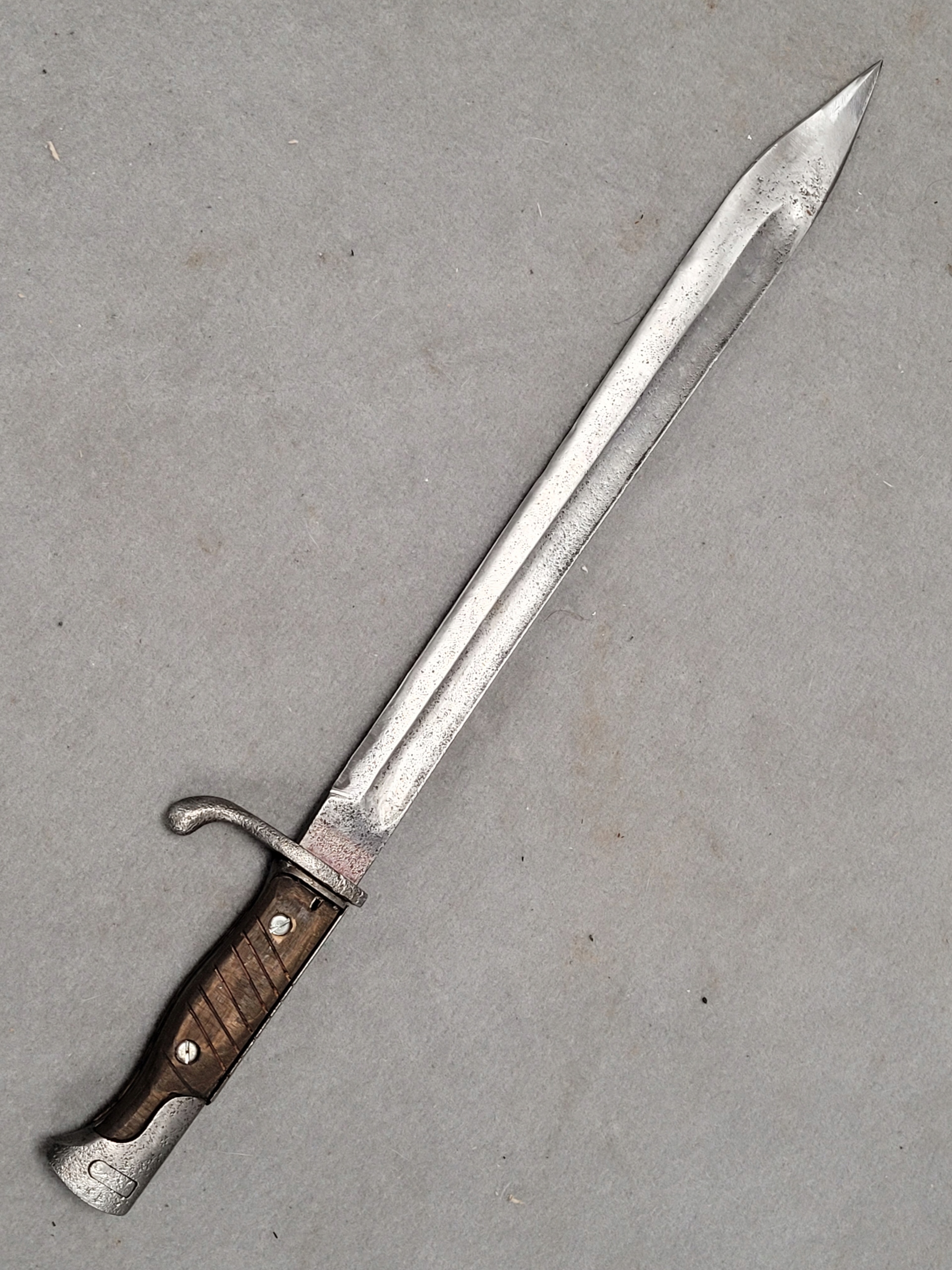 Продам німецький багнет 98/05 аркуш, задовільний стан/розбитий, лезо зі слідами корозії, ямки. Штампи виробника та квитанції частково читаються, засувка працює. неоригінальні накладки. Рухома хрестовина. Без оболонки.