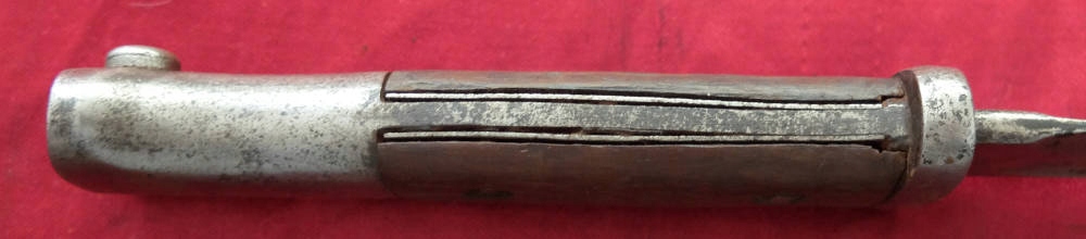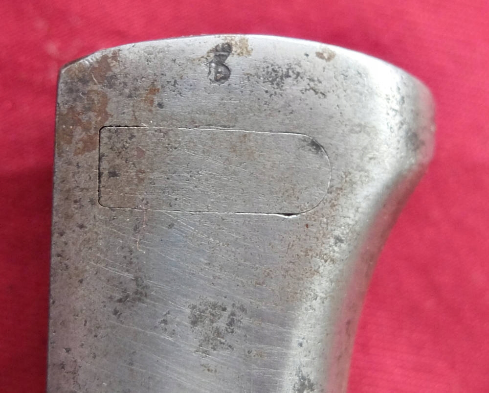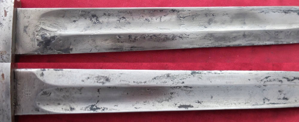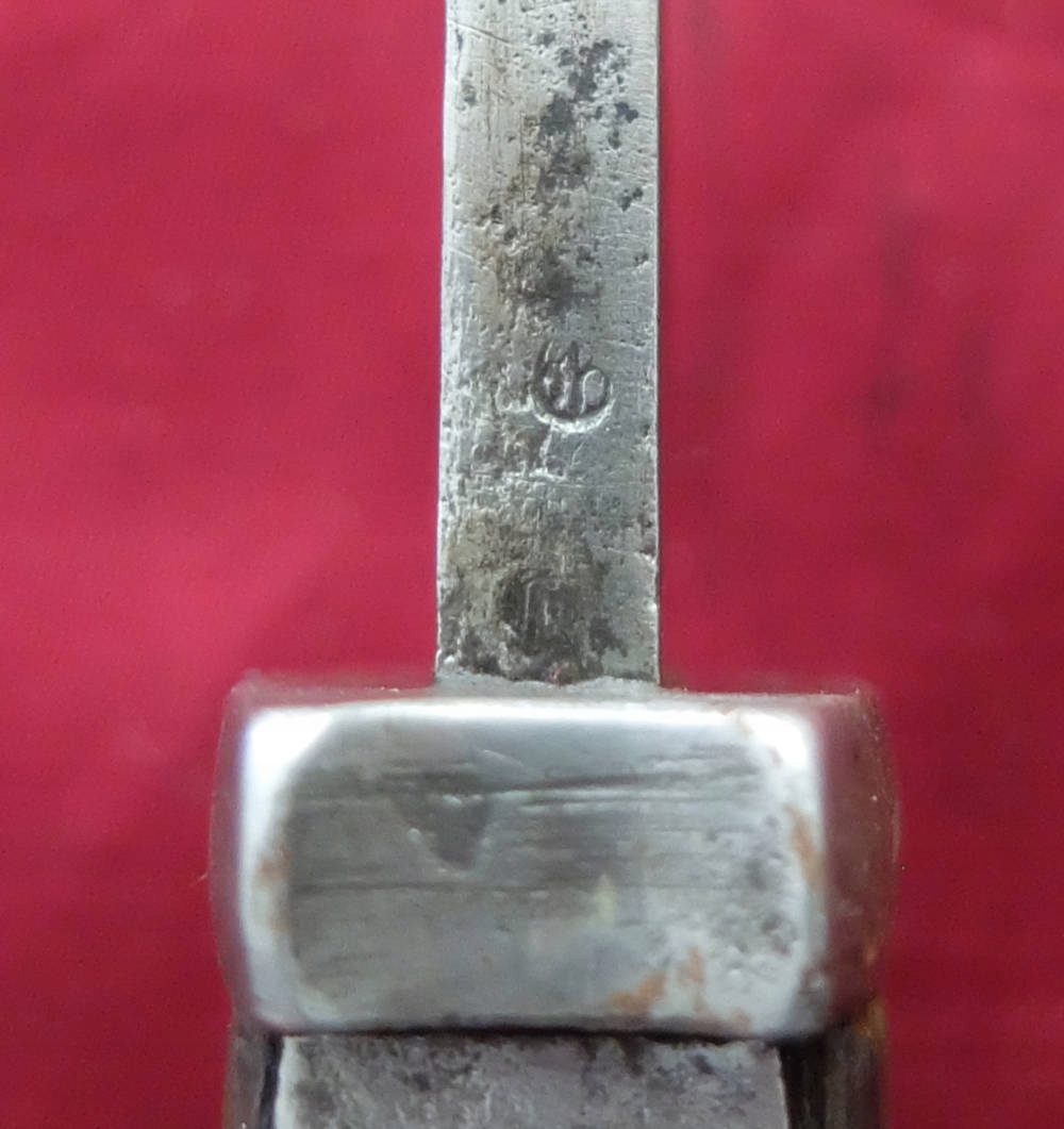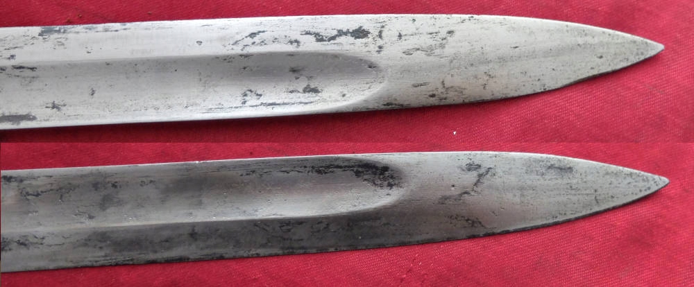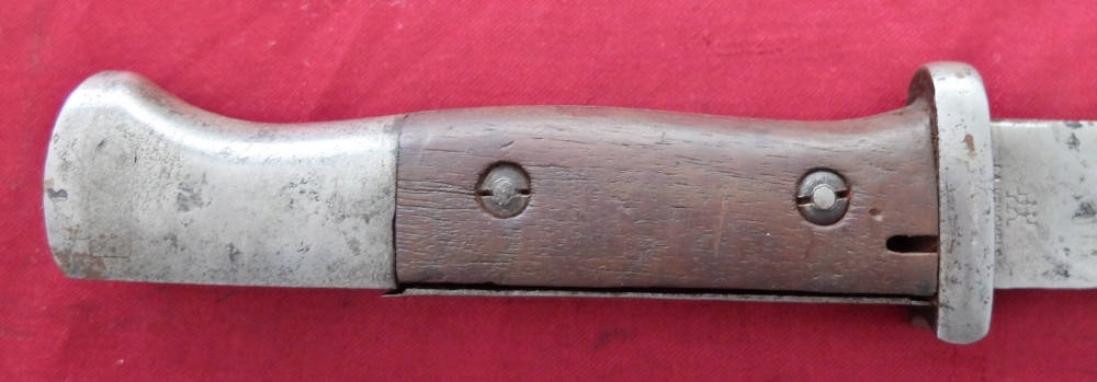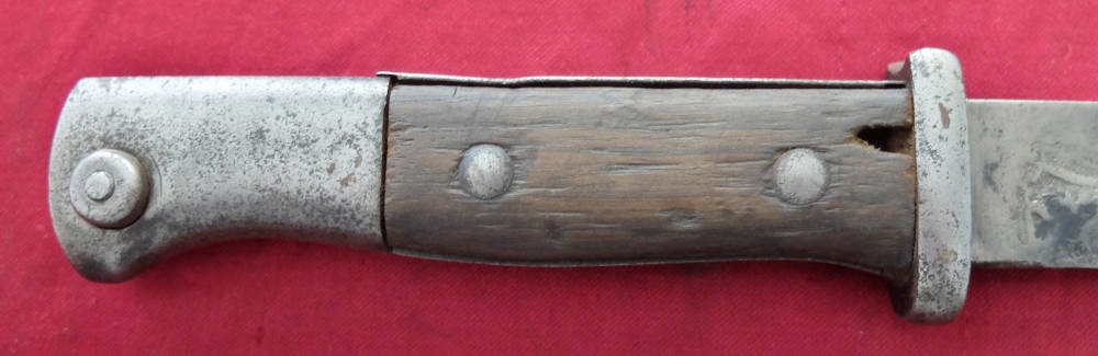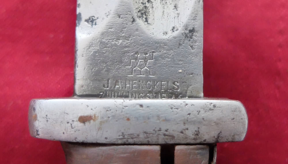 Товар, який видно на фото, добре зберігся. Лезо не відшліфоване, заточене в свою епоху, місцями має плями корозії. На порозі леза вибитий знак виробника. HENCKELS ZWILLINGSWERK. Позначки на тильній стороні леза розмиті та ледве помітні. Накладки на ручки дерев'яні, оригінальні. Багнетний замок справний. На наконечнику є прусський знак.
