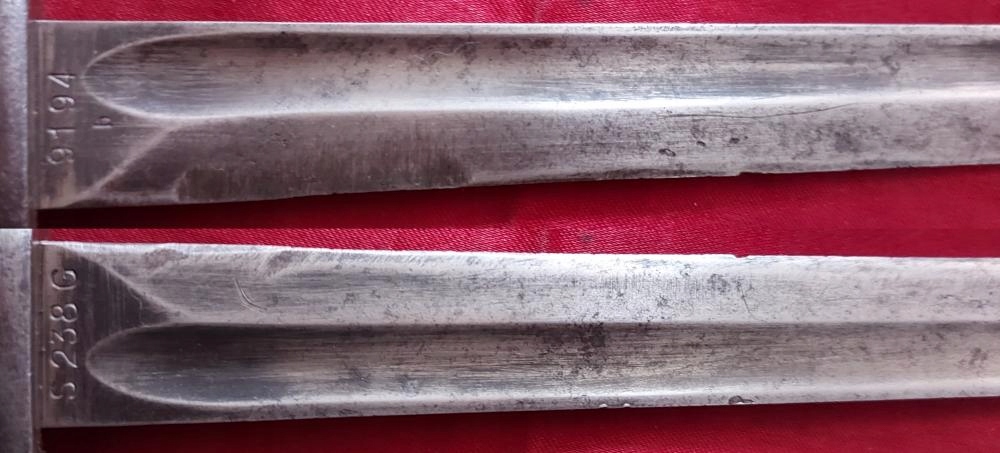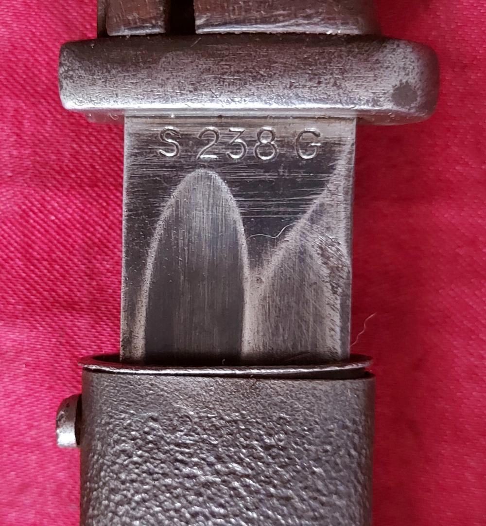 Копію видно на фото. Лезо не відшліфовано та заточено в свою епоху. На поріжку леза вказаний номер, а з іншого боку маркування S 238G. Підкладка ручки дерев'яна, оригінал. Багнетний замок працює.