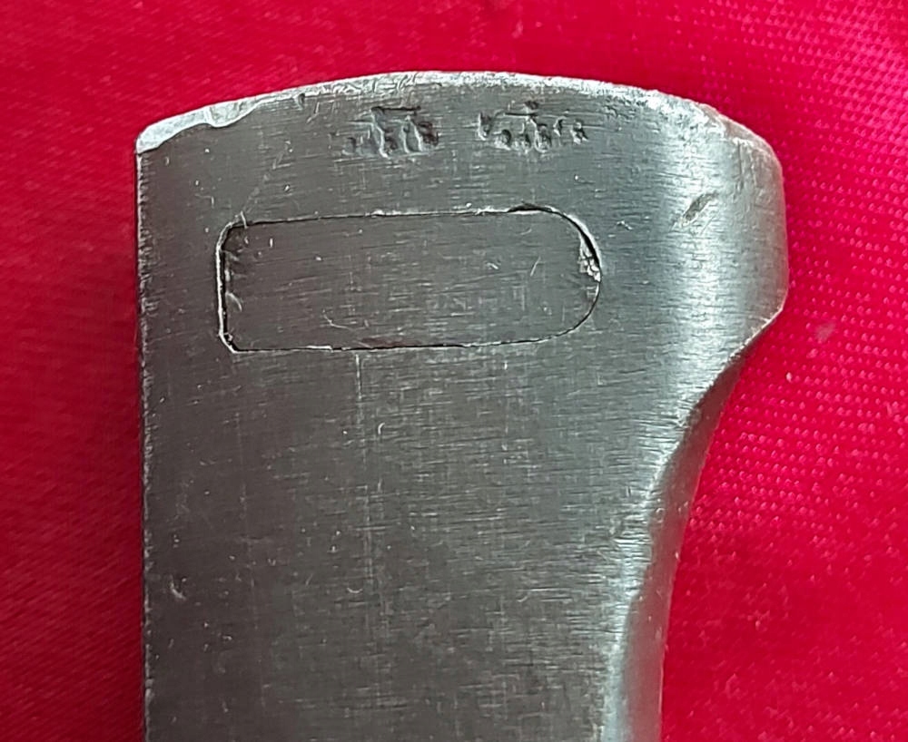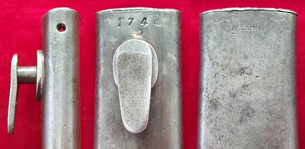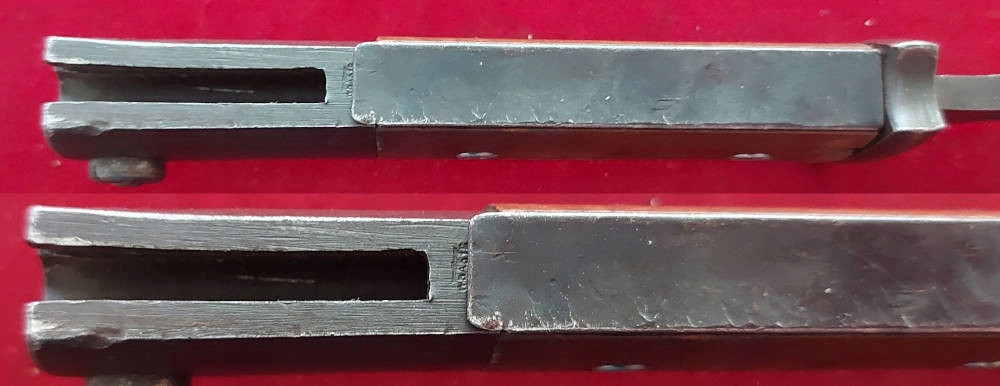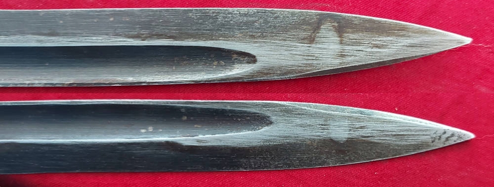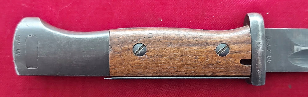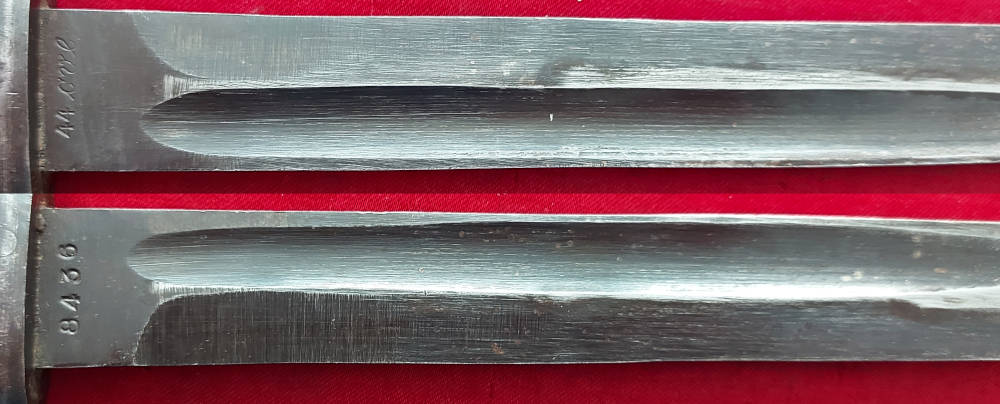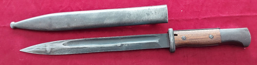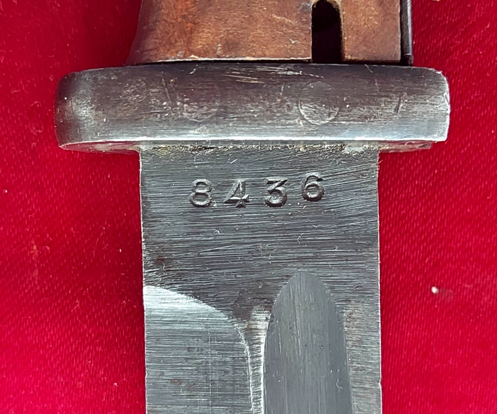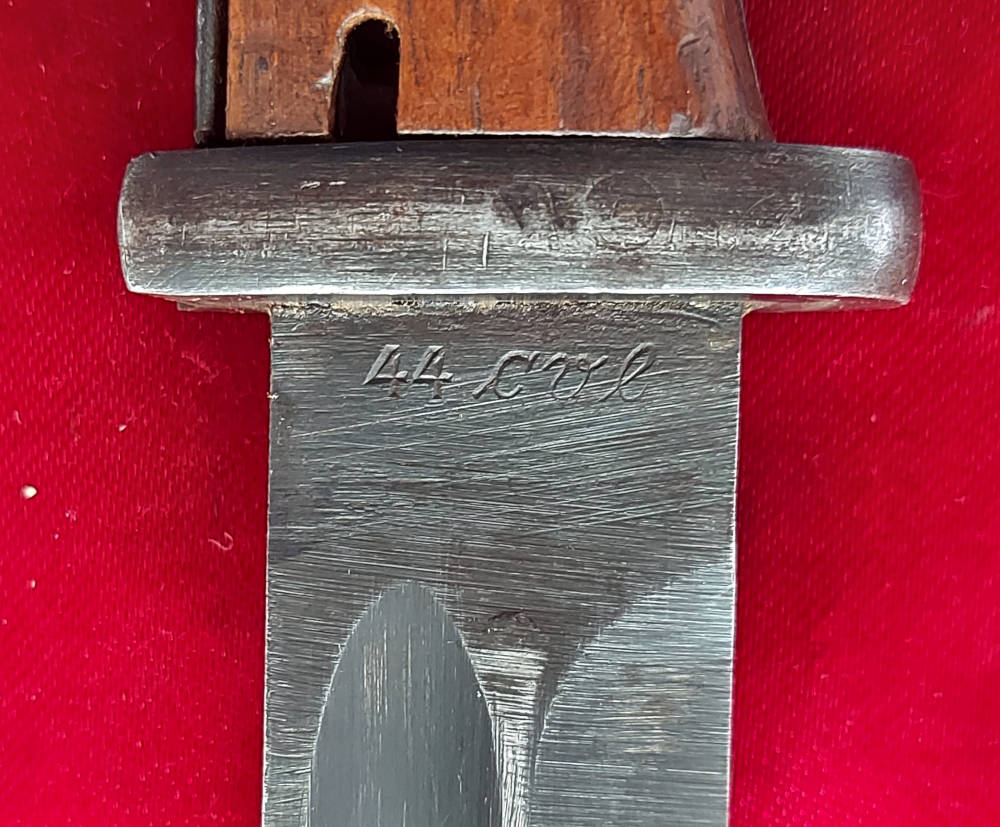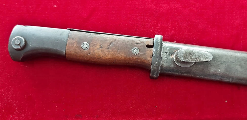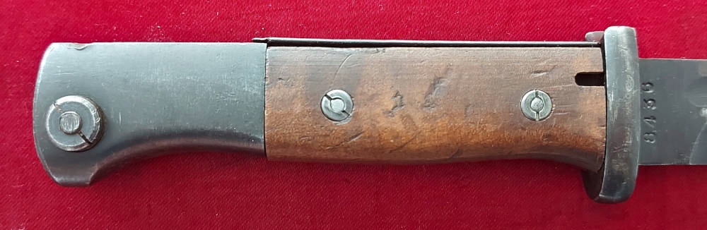 Копія на фото , дуже гарно збереглася. Невідшліфований клинок, виробництво пізньої війни, погана обробка. Його окислення збережено, але він сильно зношений. Маркування 44 cvl (виготовлено в 1944 році, заводський код WKC Waffenfabrik) вибите на поріжку леза, а число 8436 на іншій стороні леза. Накладки на ручки дерев'яні, оригінальні. Багнетний замок справний. На наконечнику вибиті знаки Waffen.