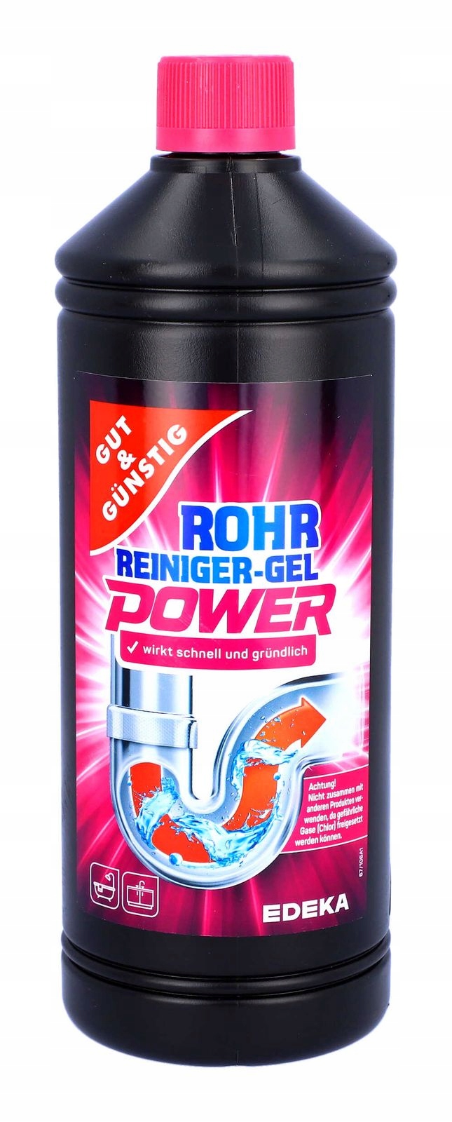 Gut&Günstig Rohr Reiniger-Gel Power — професійний засіб для очищення труб і дренажних отворів. Продукт часто незамінний на кухні та у ванній кімнаті, але він також набагато ефективніший за інші препарати. Завдяки консистенції гелю цей засіб легко досягає місця закупорки.