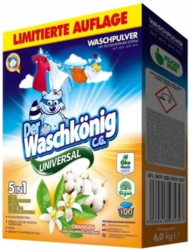 Чудові новини! лімітований випуск весна-літо 2023. Універсальний і дуже ефективний пральний порошок Der Waschkönig C.G. ємністю 6 кг з екстрактом апельсина і бавовни. Дуже ефективний, вистачає на 100 прань. Його вирізняє новий інтенсивний аромат апельсина. Дуже добре розчиняється у воді. Має високі плямовивідні та відновлюючі властивості.