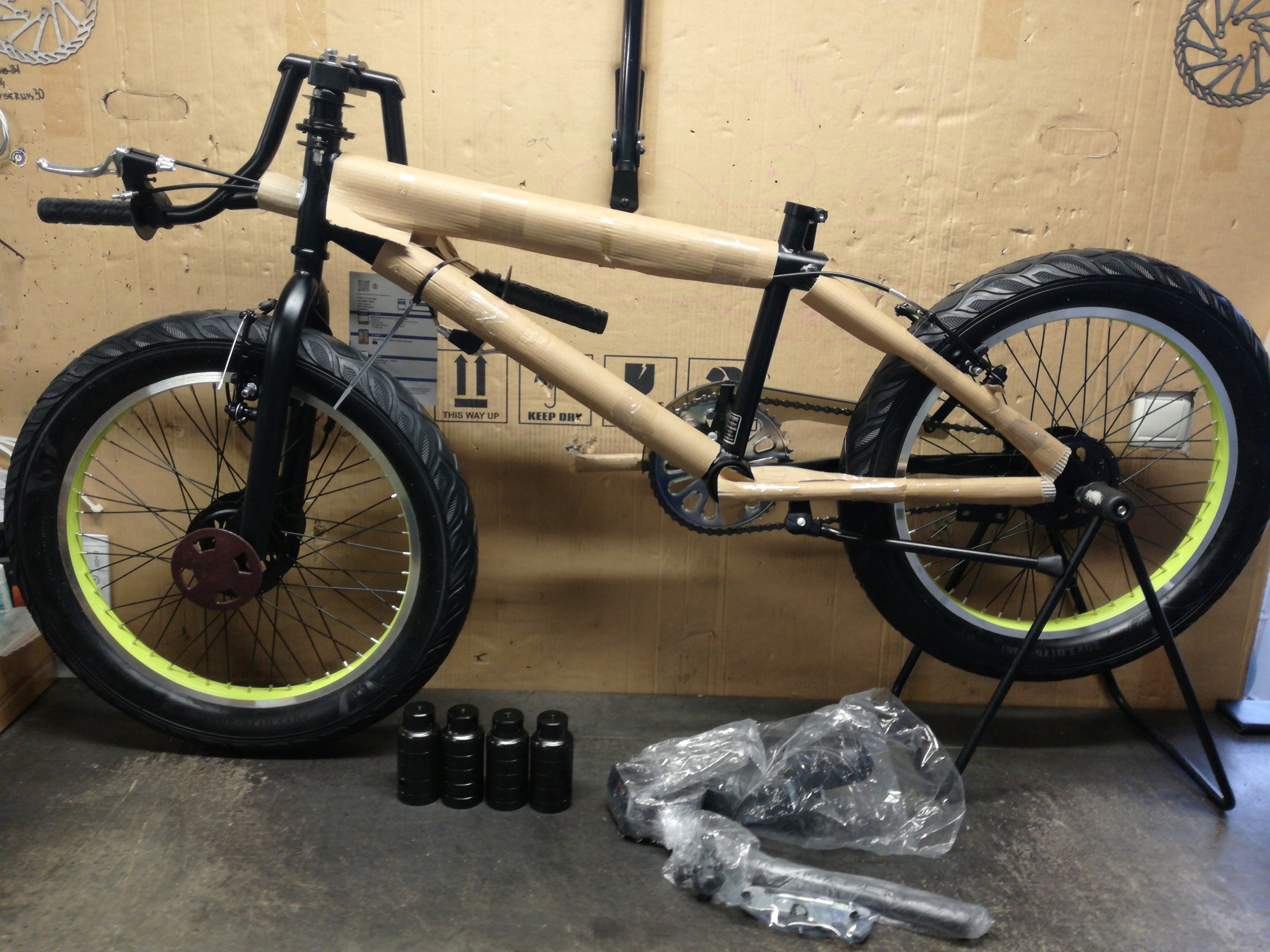 Велосипед новий, упакований в картонну коробку, частково зібраний. Потрібно прикрутити переднє колесо, кермо, сідло, педалі та відрегулювати гальма. Набір інструментів для самостійного складання включено.