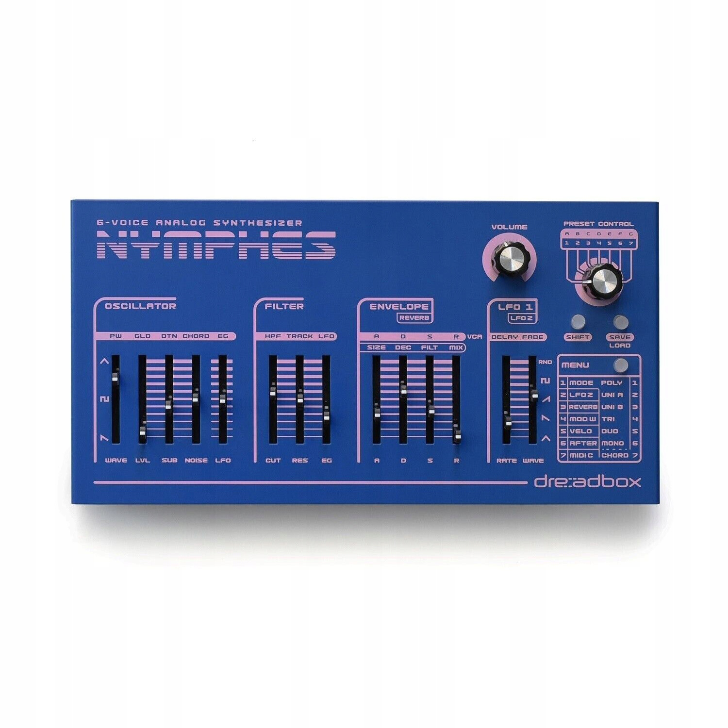Разом з Nymphes Dreadbox представляє повністю аналоговий настільний синтезатор, який можна відтворювати поліфонічно шістьма голосами та має кілька сюрпризів. Структура Nymphes нагадує Roland Juno 60, але звучить по-своєму. Кожен із шести голосів має осцилятор, який можна зменшити від пилкоподібного до квадратного та трикутного, а також пропонує для цього ШІМ. Субоцилятор і генератор білого шуму доповнюють звуковий спектр і перевірені компоненти. Для обробки використовується резонансний фільтр низьких частот 24 дБ з низькорезонансним фільтром високих частот і точне відстеження на шляху сигналу. Для модуляції генератора, фільтра та VCA є дві огинаючі ADSR і LFO з п'ятьма формами хвилі. Архітектуру голосу можна використовувати в семи різних конфігураціях: поліфонічний, унісон із 6 або 4 голосами, 3 ноти з 2 голосами одночасно, дуофонічний із голосами 2x3, монофонічний та акордовий режим із власними акордовими шкалами.