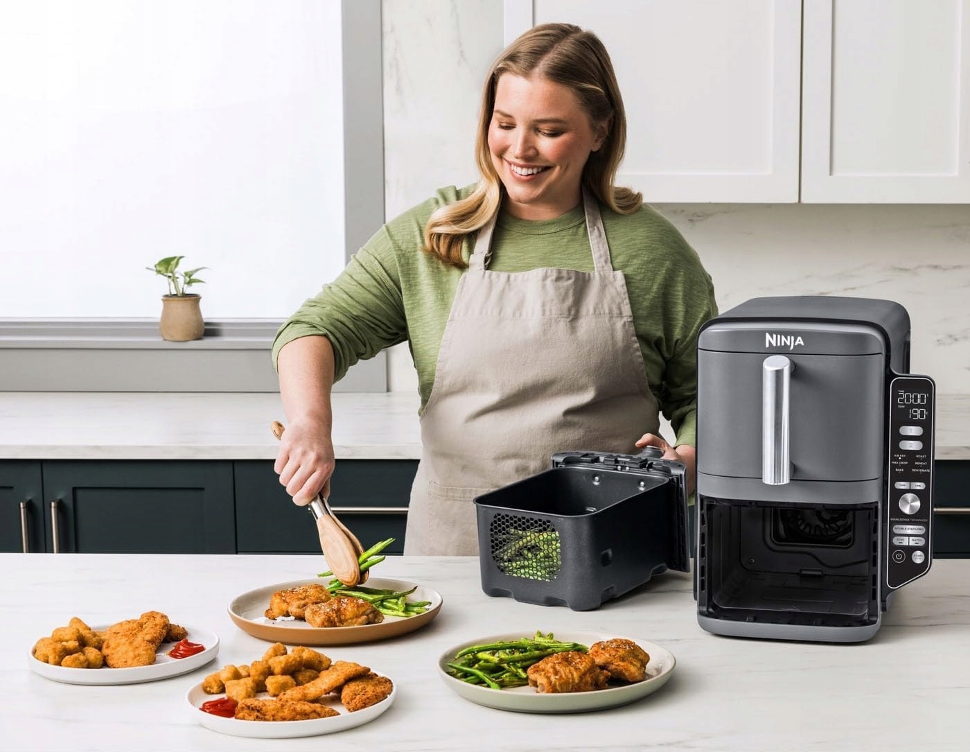 - Включіть: Ninja Double Stack Frykitnik для гарячого повітря 9,5 л (плагін ЄС), 2 х ящиків 4,75 л, 2 x не стимулююча чіткіша плита, 2 х. Частини підходять для миття посудомийної машини. Розміри: висота 38,5 см х ширина 28 см х глибина 47 см. Вага: 10,3 кг. Колір: сірий