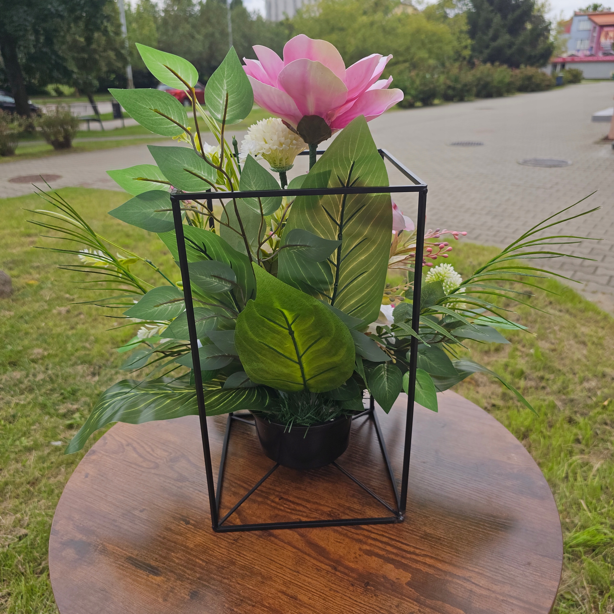 КРЕД ЗІ ШТУЧНИХ КВІТІВ МАГНОЛІЇ ПРЕМІУМУ МІСЦЯ В МЕТАЛЕВІЙ РАМЦІ З ПЛАСТИКОВОЮ ПІДСТАВКОЮ ТА БЕТОННИМ ОБТЯЖНИКОМ.