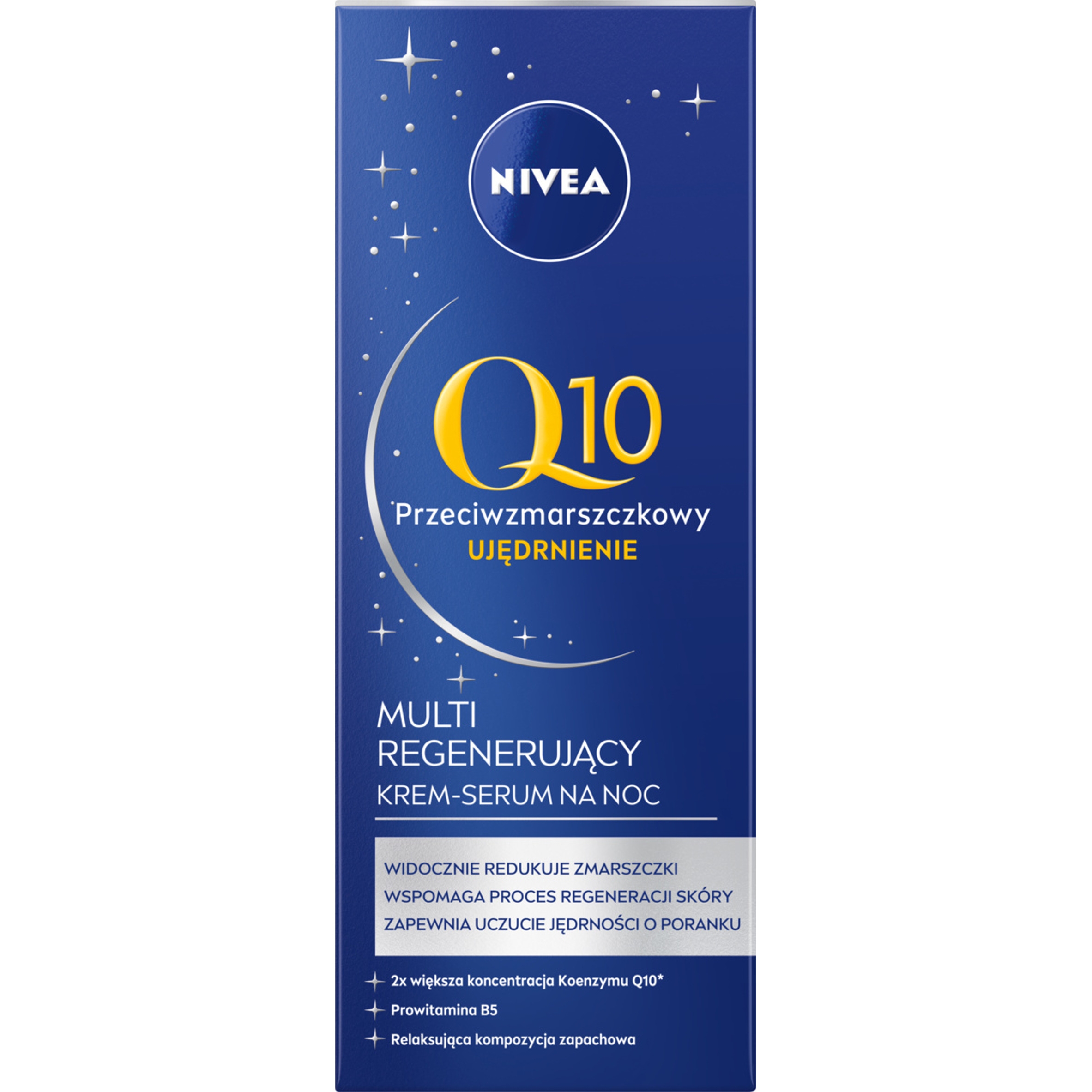 Нічна крем-сироватка NIVEA Q10 Firming Multi Regenerating Cream-Serum допомагає вашій шкірі максимально використати час сну для інтенсивної регенерації. Активно бореться зі старінням**, помітно зволожує та омолоджує шкіру. Формула містить подвійну концентрацію чистого коензиму Q10*, який заряджає шкіру енергією, допомагаючи максимізувати природний процес регенерації шкіри**. Провітамін В5 підтримує процеси відновлення шкіри, допомагаючи нейтралізувати мікропошкодження, що виникли протягом дня**. Розслаблююча ароматна композиція \"Sweet night™ fragrance\" допомагає розслабити почуття, готуючи шкіру до повноцінного нічного відпочинку. Після 1 ночі: добре зволожена, пружна на вигляд шкіра Через 14 ночей: помітне зменшення зморшок Після 28 ночей: подальше видиме зменшення зморшок * порівняно з денним і нічним кремом Q10 ** дослідження in vitro