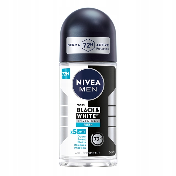 Nivea Roll On Men Black White Invisible Fresh 50 мл Антиперспірант NIVEA MEN Black&White Invisible Fresh – засіб, який забезпечить вам ефективний і надійний захист від потовиділення, не ризикуючи забруднити улюблений одяг. Антиперспірант NIVEA забезпечує захист 5-в-1 і захищає від неприємного запаху, поту, жовтих плям, білих плям і подразнення. NIVEA Black&White не залишає жовтих плям на білому одязі або білих слідів на чорному одязі. Унікальна формула захищає вас від надмірного потовиділення протягом 48 годин, одночасно піклуючись про вашу шкіру. Освіжаючий аромат забезпечує відчуття свіжості та чистоти.