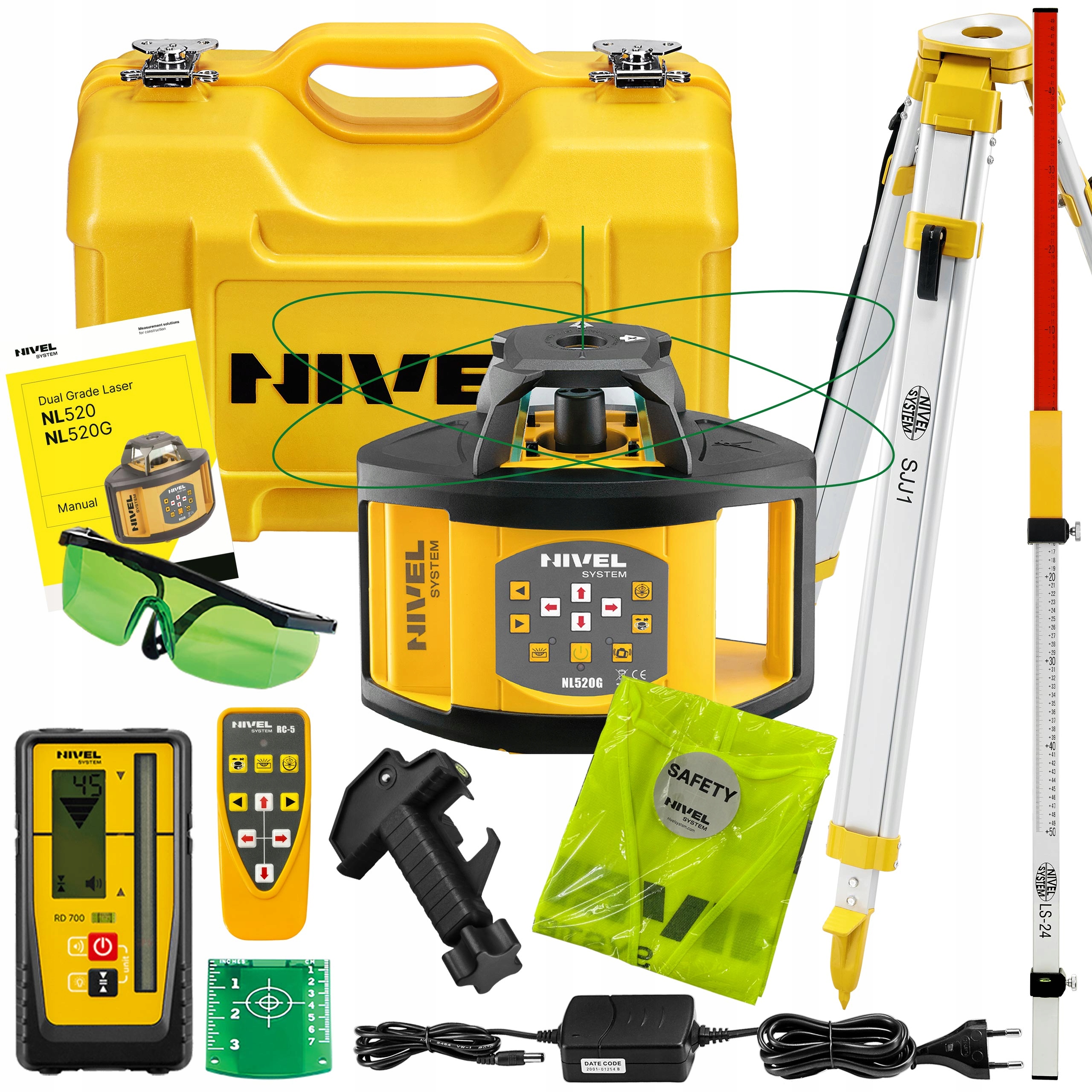 nl520g - це дуже просто та швидке використання. Просто покладіть його на штатив, лазерну полицю або іншу стабільну основу і увімкніть потужність. обладнання автоматично перелічено. лазерна голова рівня, обертається навколо своєї осі, створює ідеально розпущену лазерну площину, яка здатна покрити своїм діапазоном понад 19 гектарів місцевості. вимірювання різниці висот проводиться однією людиною, використовуючи одну людину, використовуючи лазерний датчик з навіть видимими показаннями. У випадку роботи всередині будівлі дуже часто використання датчика не потрібно, оскільки лазерний промінь видно. У цьому випадку ми можемо використовувати лазерний щит з міліметровою шкалою (лазерне обладнання Nivel).