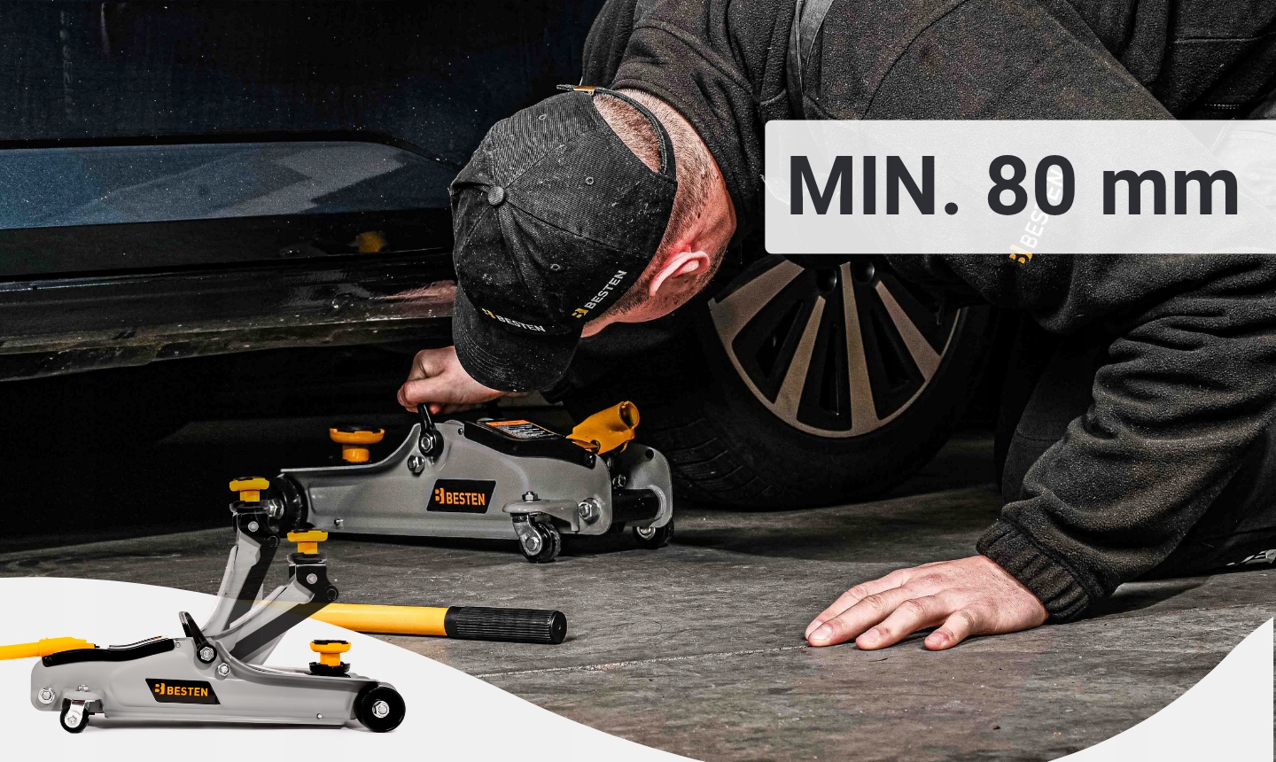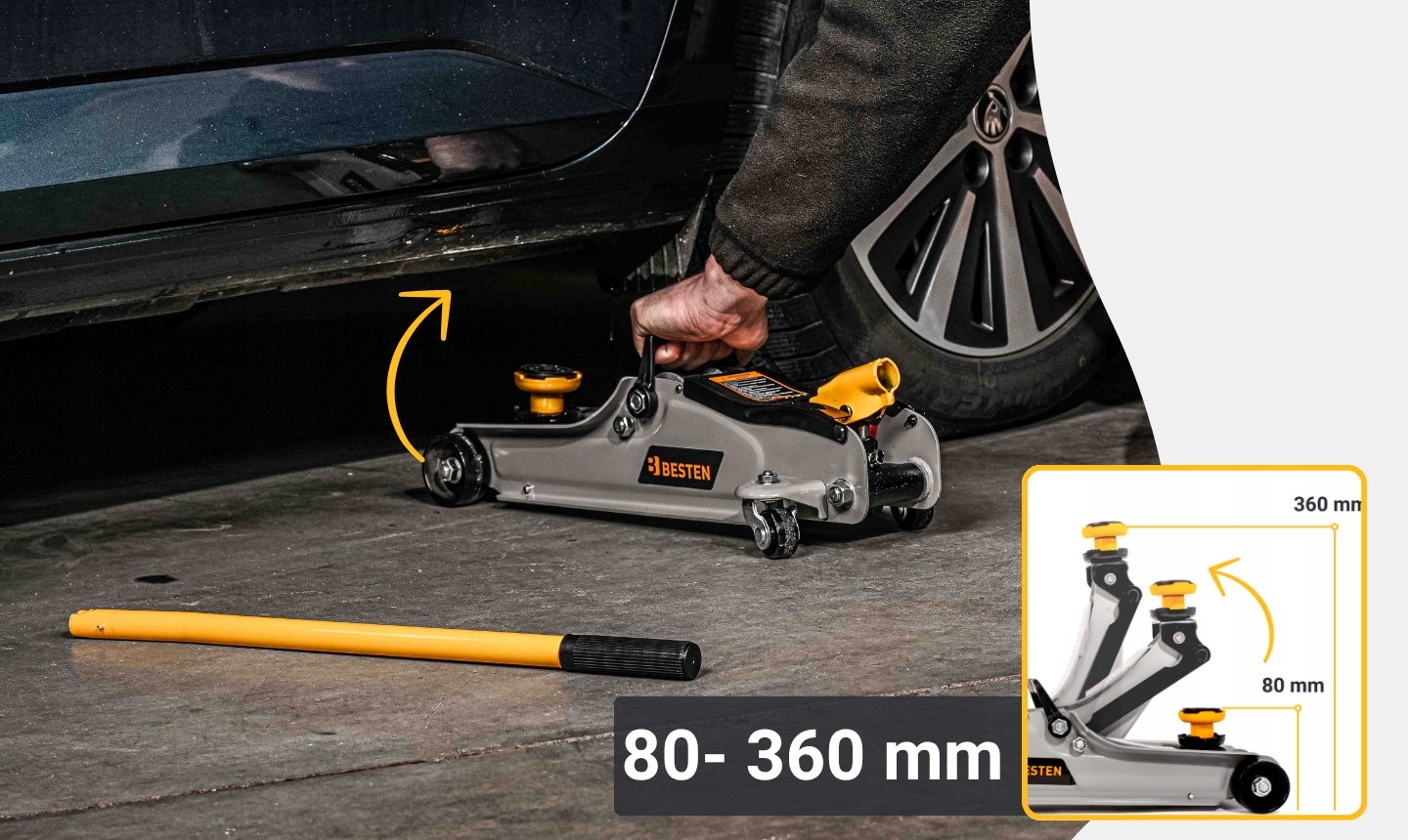 BESTEN BE0002880 - це низькопрофільний гідравлічний підйомник "жаба" вантажопідйомністю 2,5 т, призначений для швидкого та безпечного підйому автомобілів. Стійка сталева конструкція, широкі колеса і діапазон 80-360 мм полегшують роботу в гаражі і в дорозі. У набір входить валіза, гумова підкладка та інструкція PL - у вас є все, щоб почати відразу.