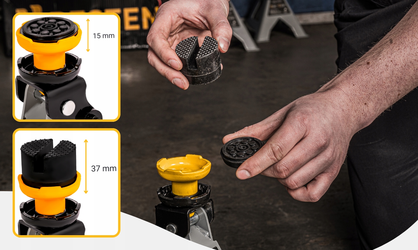 2 гумки в комплекті (плоска та рифлена) - захист порогу та універсальна посадка. Завдяки їм ви можете безпечно піднімати як автомобілі з плоским шасі, так і з порогами, посиленими пазами.