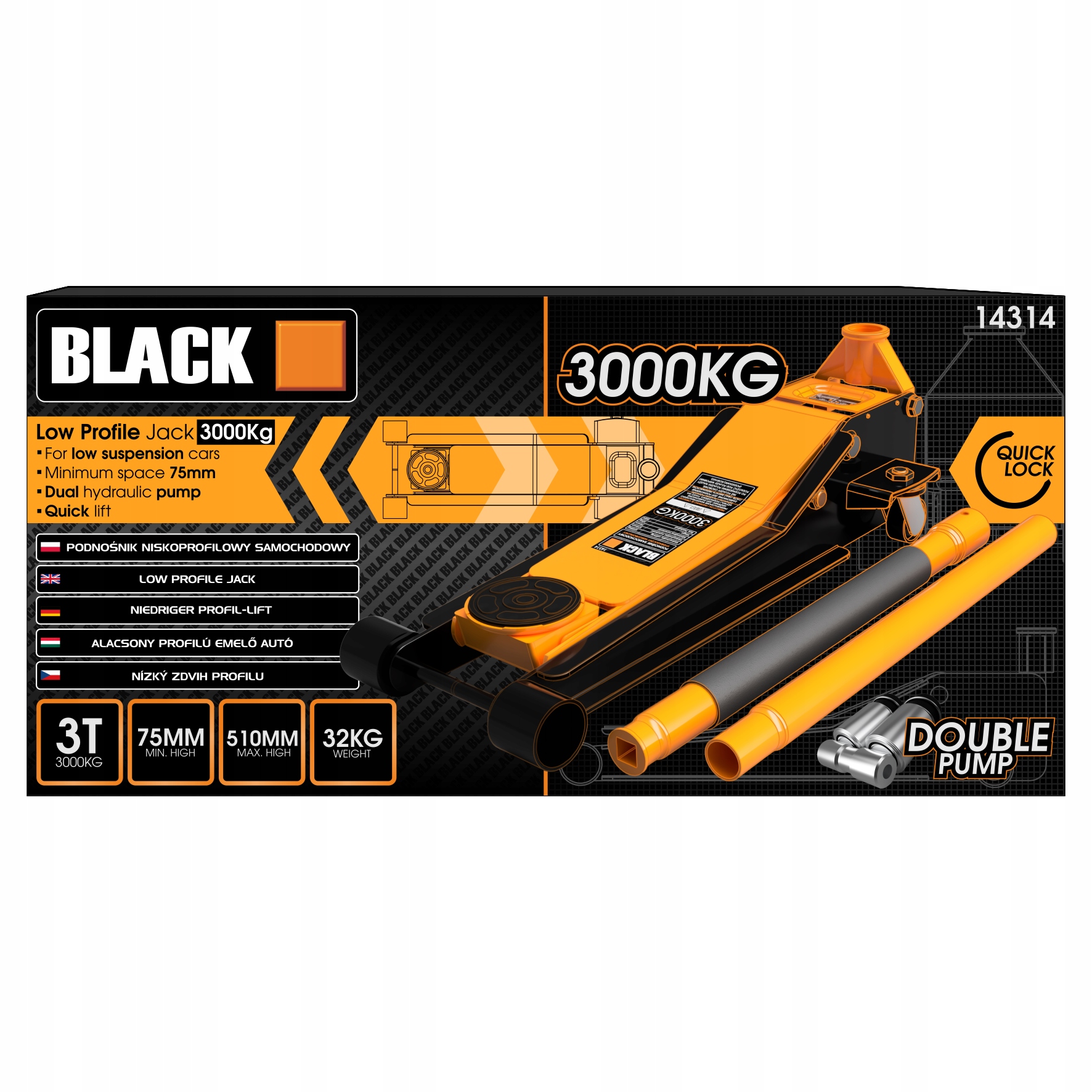 НИЗЬКОПРОФІЛЬНИЙ ГІДРАВЛІЧНИЙ ДВОПОРШНЕВИЙ ПІДІЙМАЧ ŻABA 3T 510мм 32кг BLACK