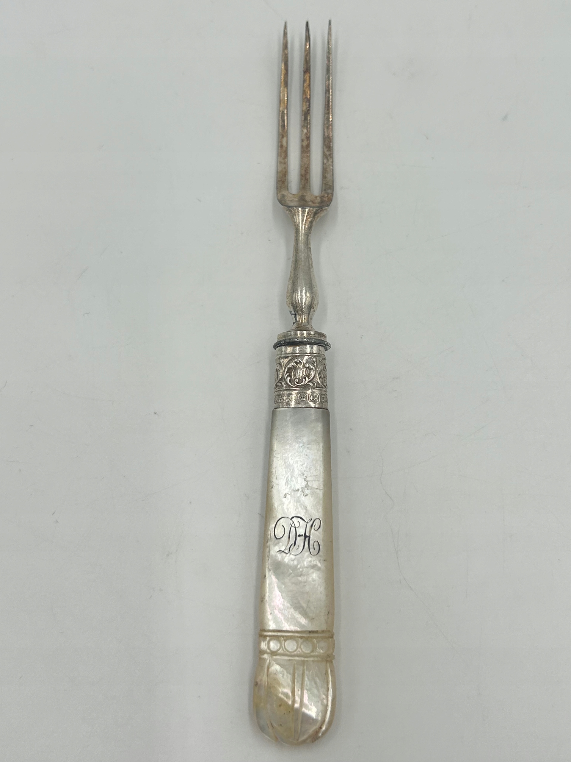 Продається унікальна старовинна виделка для десерту/закуски англійського походження, датована приблизно серединою 19 століття. Виготовлений із поєднання срібла 925 проби та перламутрової ручки. На срібній фурнітурі є англійські клейма, а на ручці витончена монограма з гравіюванням літер «DH». Все це прикрашено орнаментом у вікторіанському стилі. Предмет колекціонування з високою естетичною цінністю — ідеальний для експонування або як частина колекції.