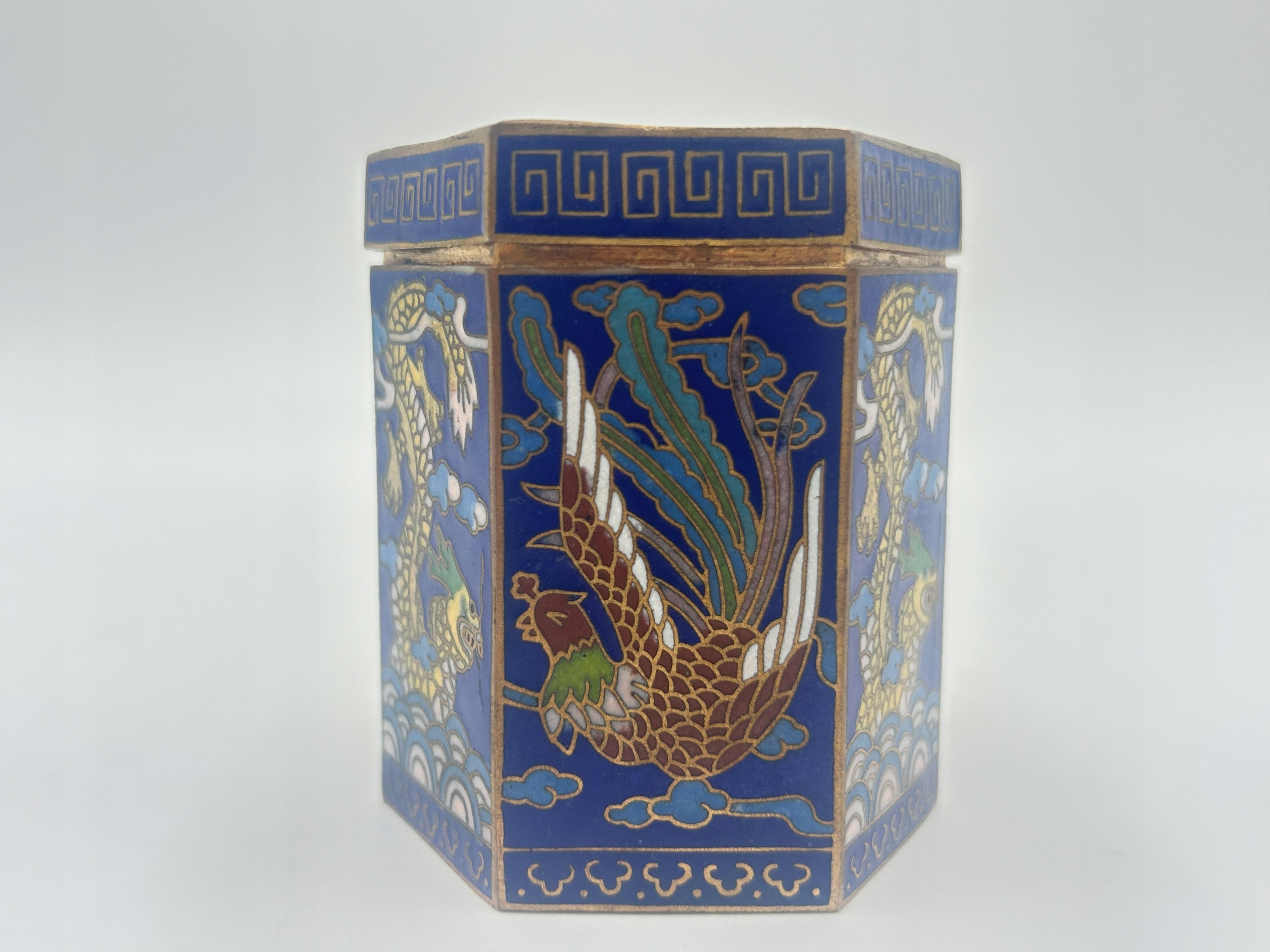 Я представляю вам рідкісну коробку для закуски, шкатулку, прикрашену технікою Cloisonne - стільниковою емальною. Форма шестикутника - у кольорі інтенсивного синього кольору, прикрашеної зображенням драконів та раю птахів. Зроблено з великою увагою до збереження деталей та безлічі деталей. Насичення кольору додає характеру та унікальності. Я рекомендую !!!