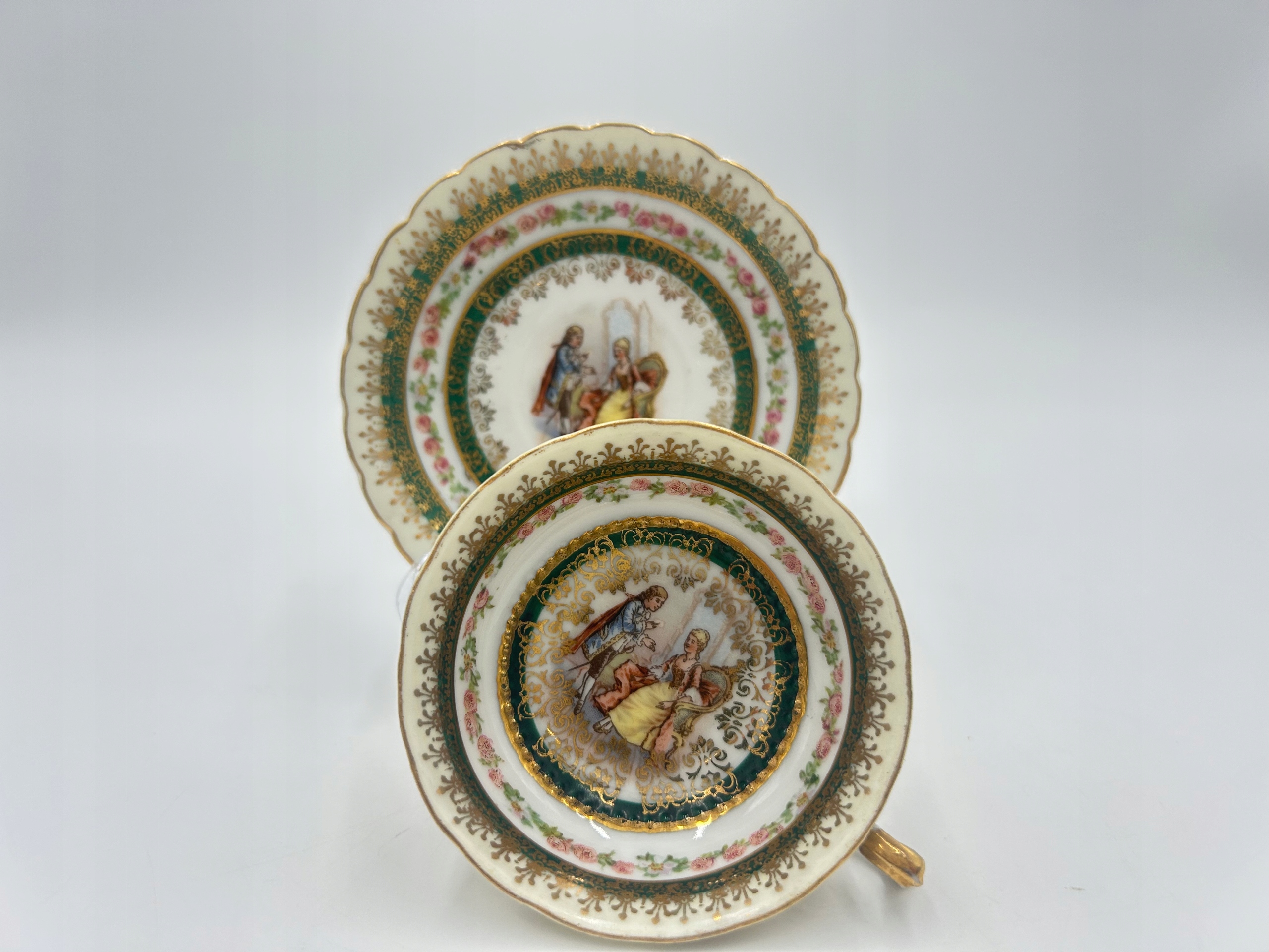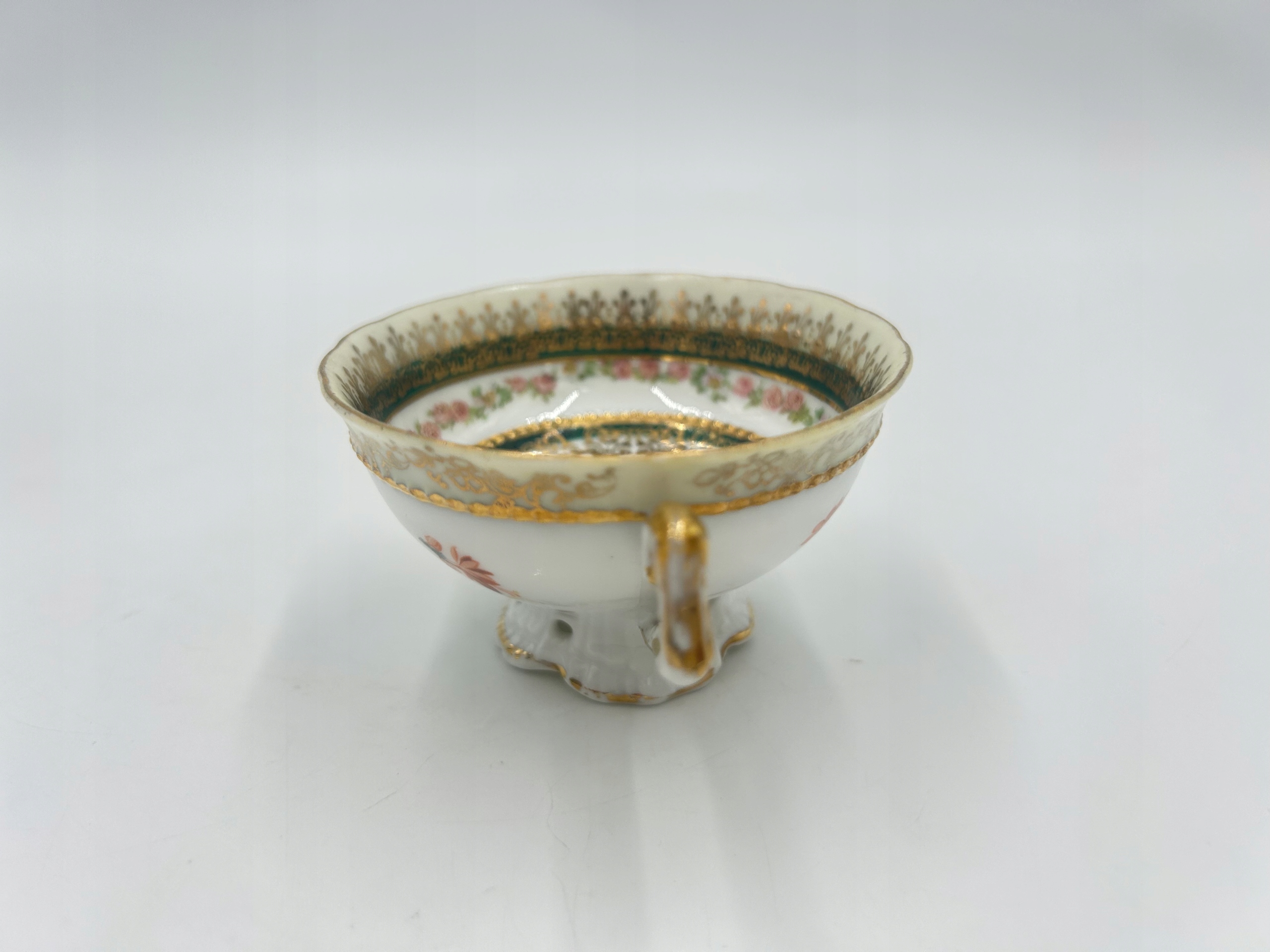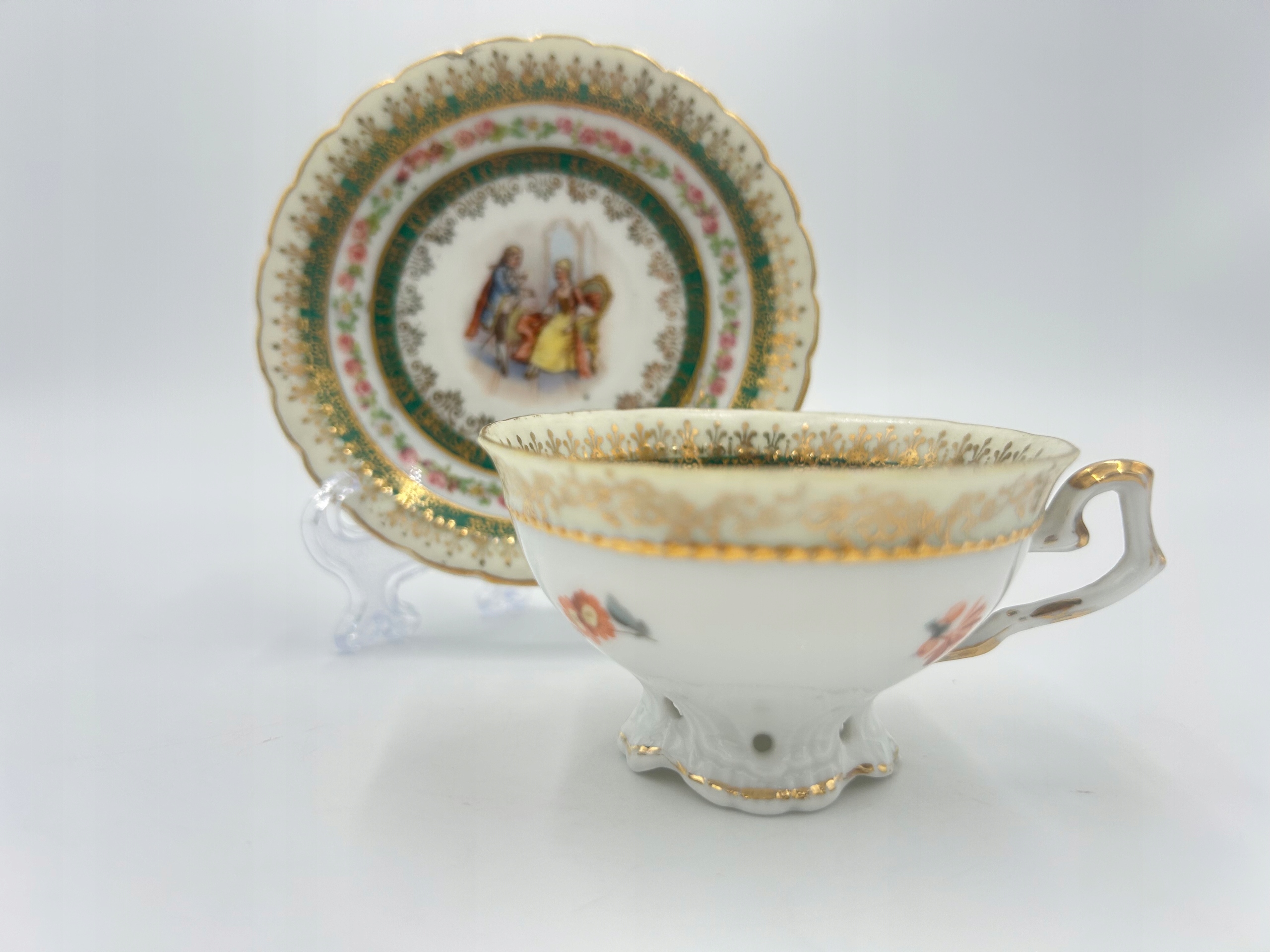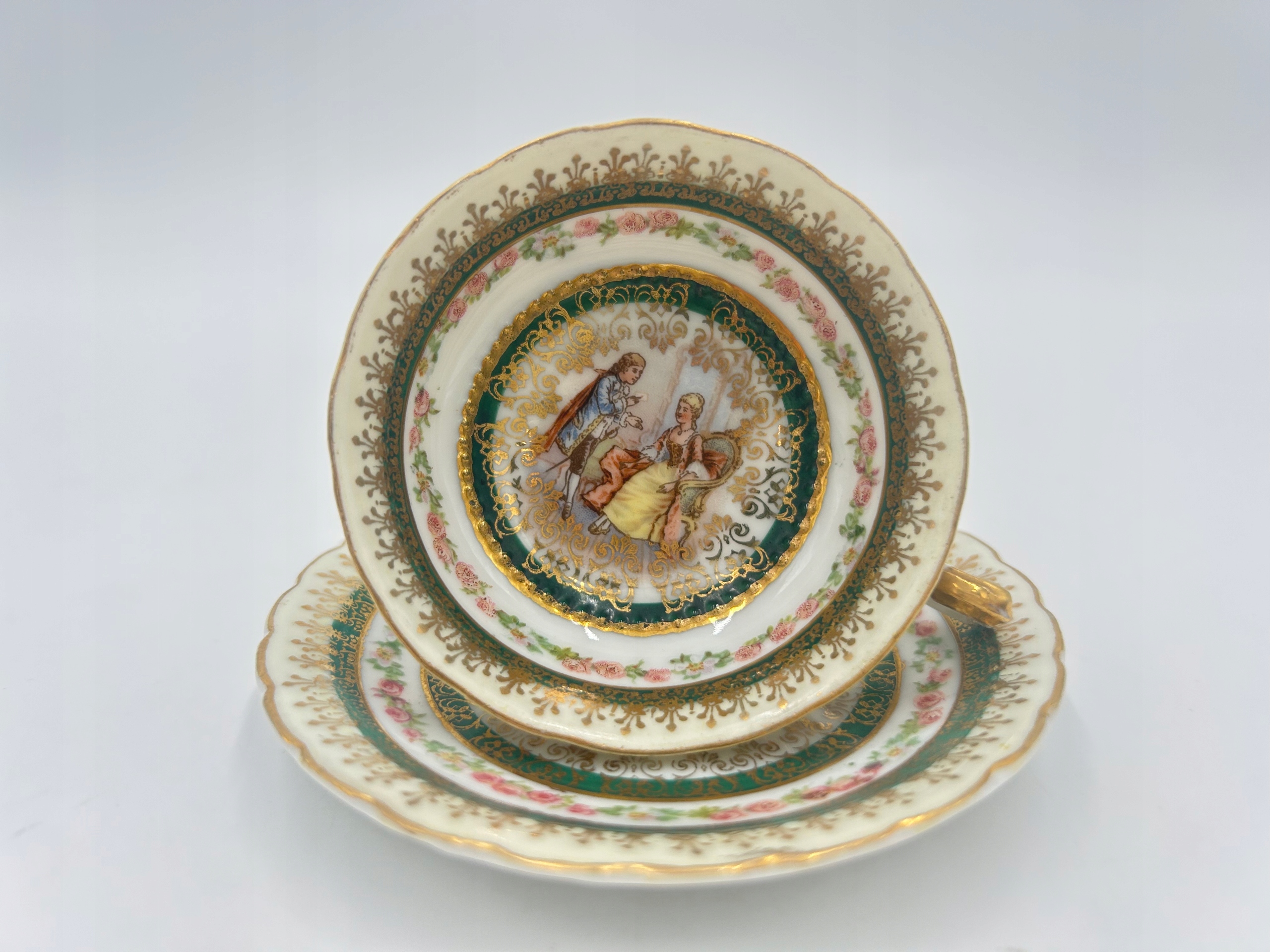Елегантна чашка з блюдцем, виготовлена з порцеляни, багато прикрашена квітковим мотивом, зеленим і золотим. Всередині кубка зображена сцена, пара в стилі рококо. Ідеально підходить для колекції, унікальна прикраса в стильній вітрині.