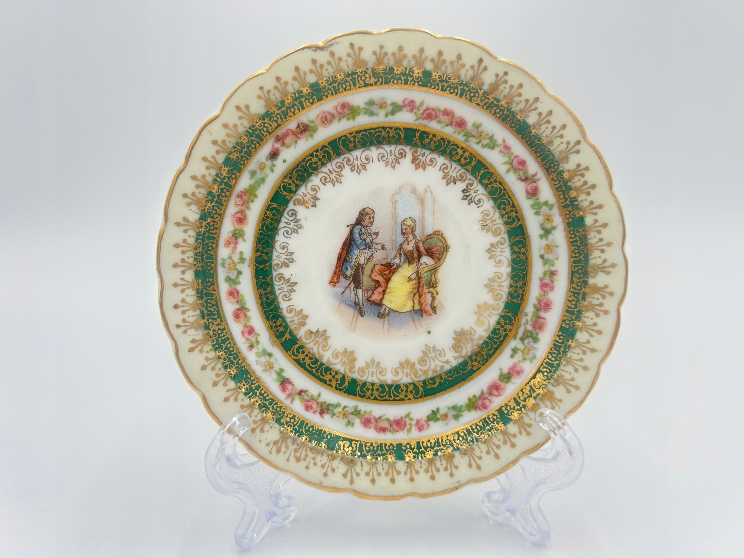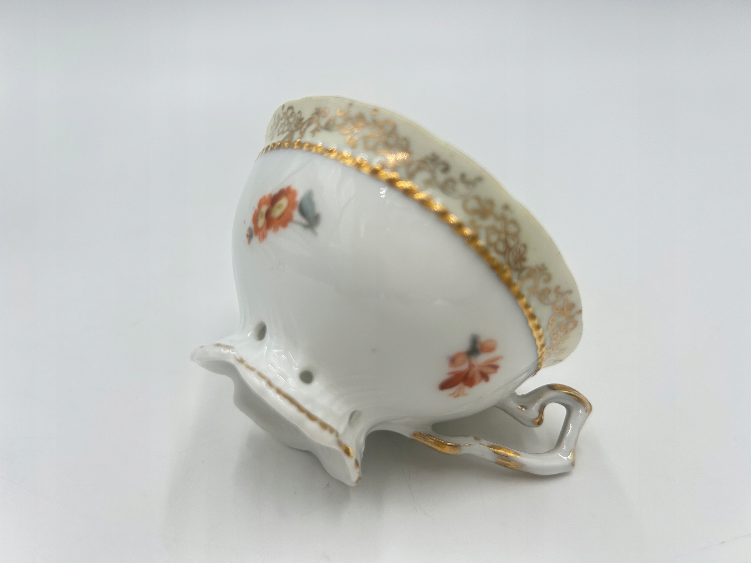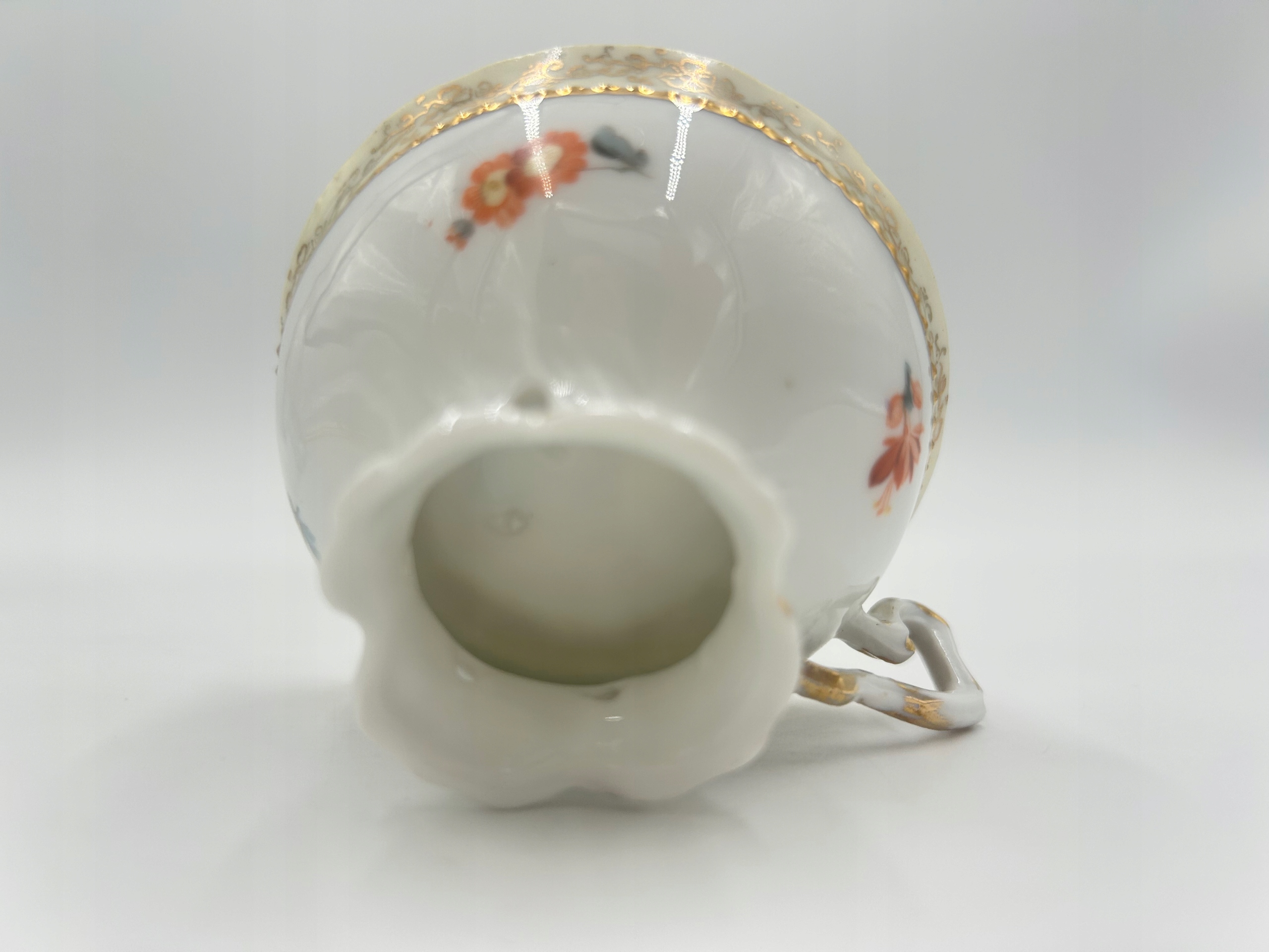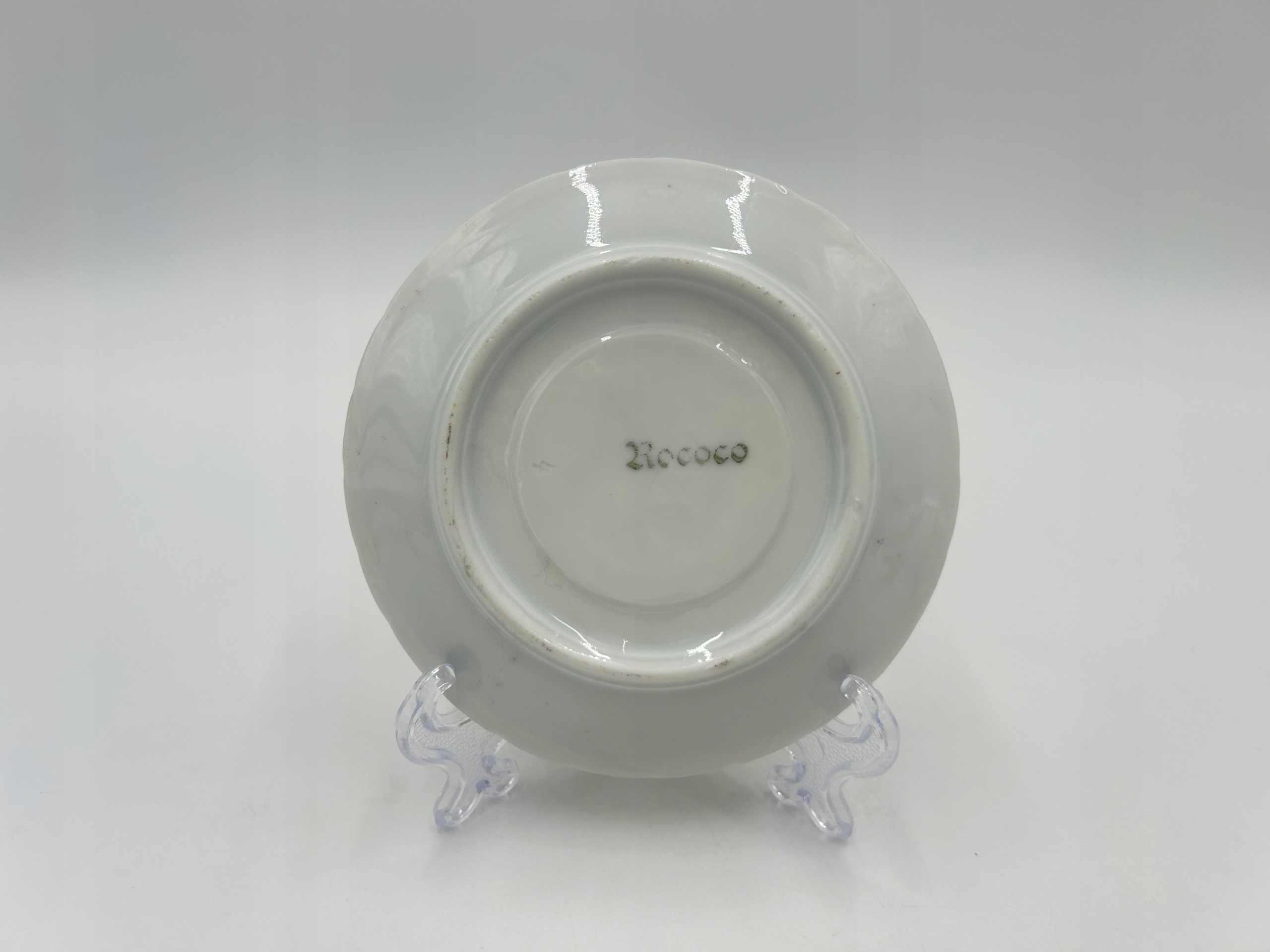 Елегантна чашка з блюдцем, виготовлена з порцеляни, багато прикрашена квітковим мотивом, зеленим і золотим. Всередині кубка зображена сцена, пара в стилі рококо. Ідеально підходить для колекції, унікальна прикраса в стильній вітрині.