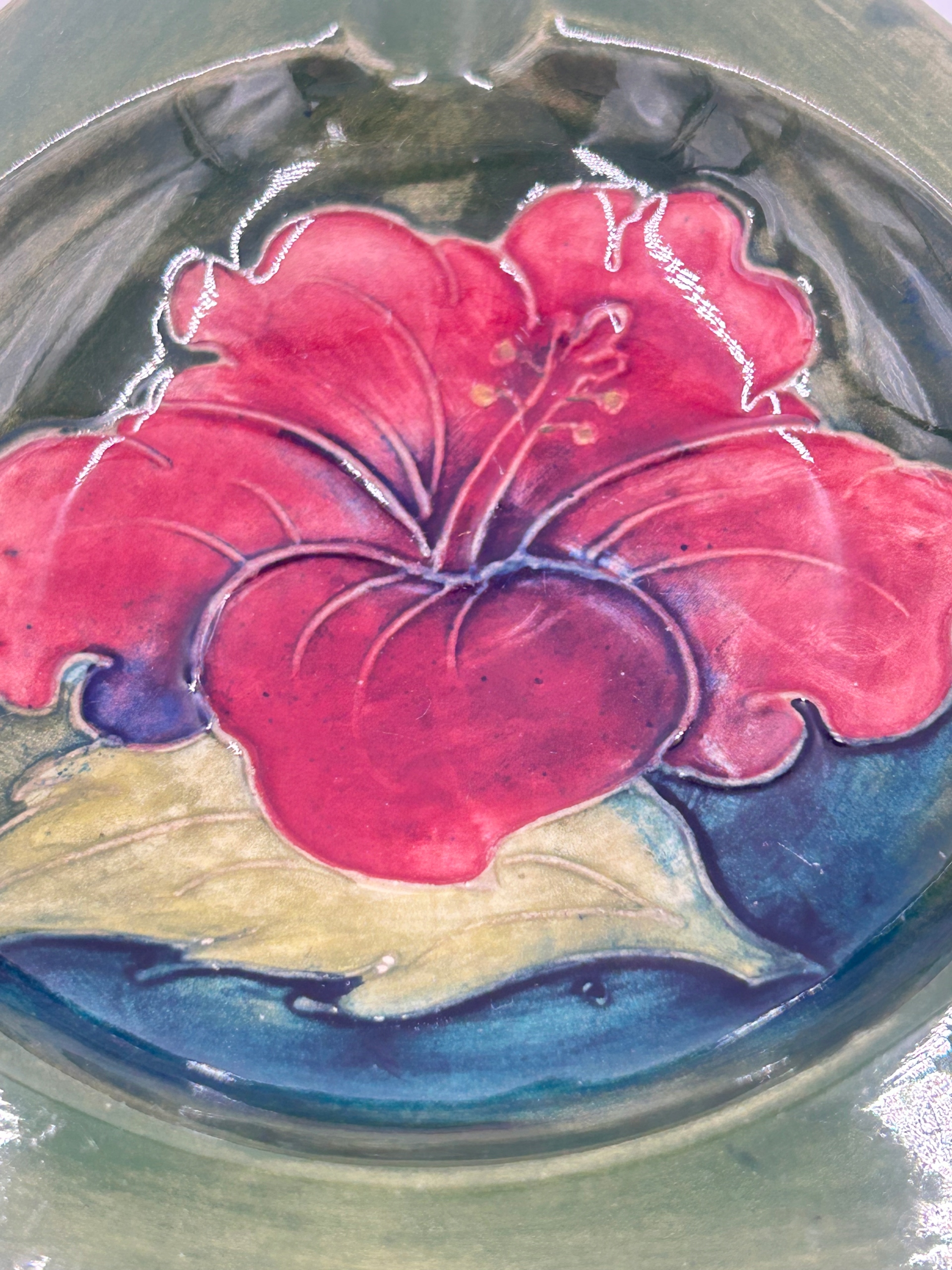 Декорація демонструє квітку гібіскуса насичених червоного, зеленого та синього кольорів, виконану в техніці тубелінг з опуклою глазур’ю, нанесеною вручну.