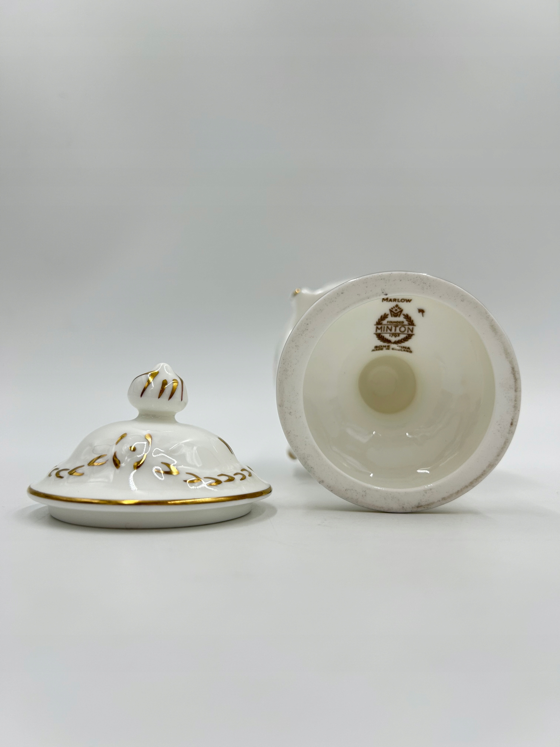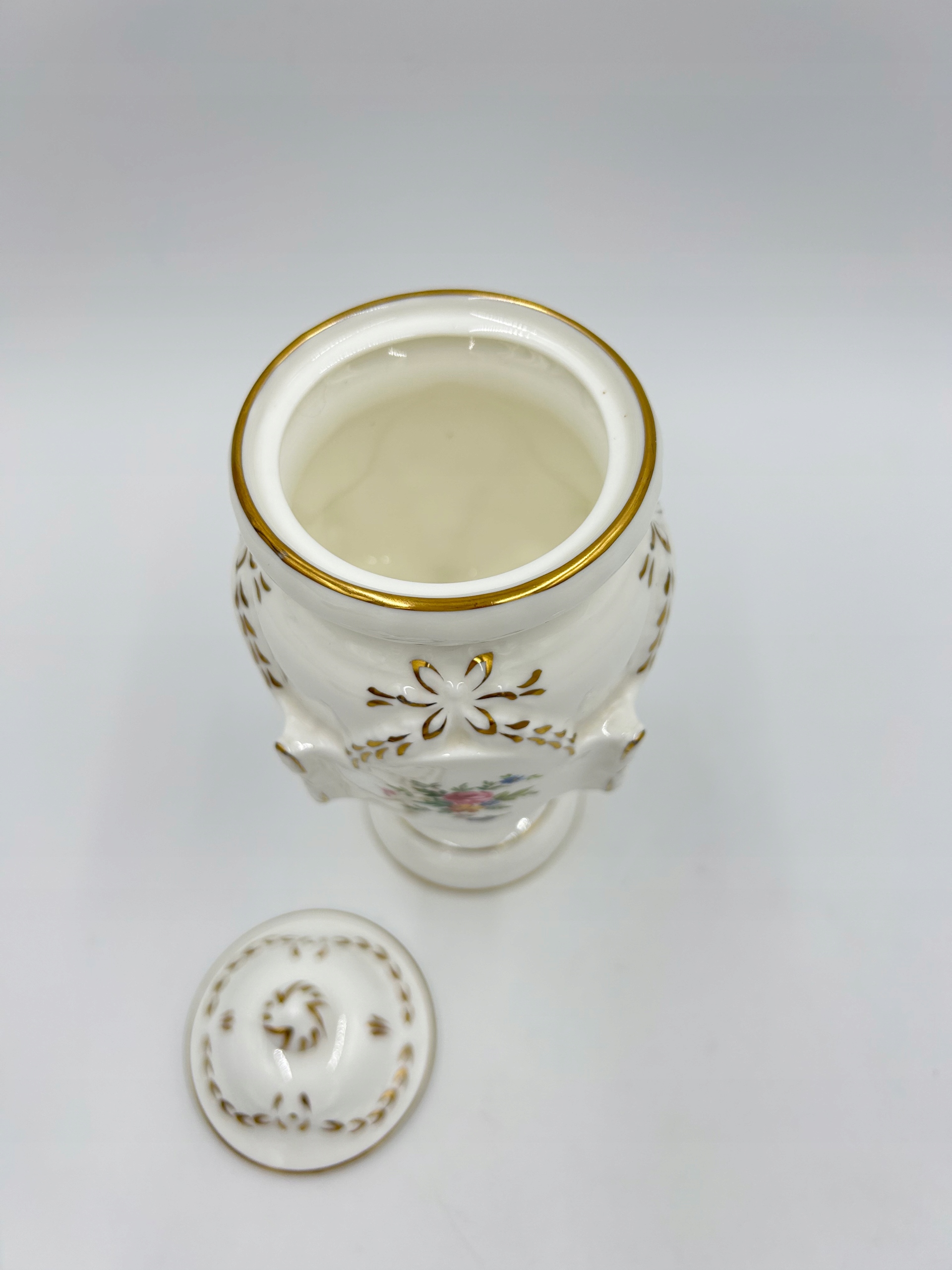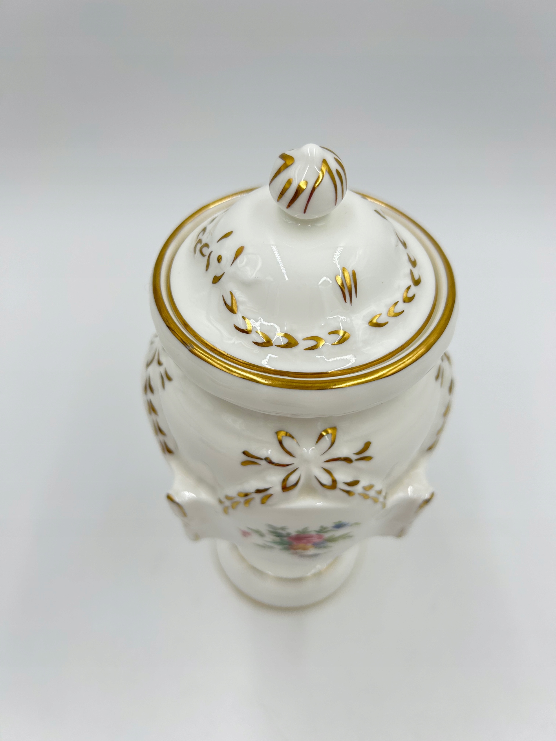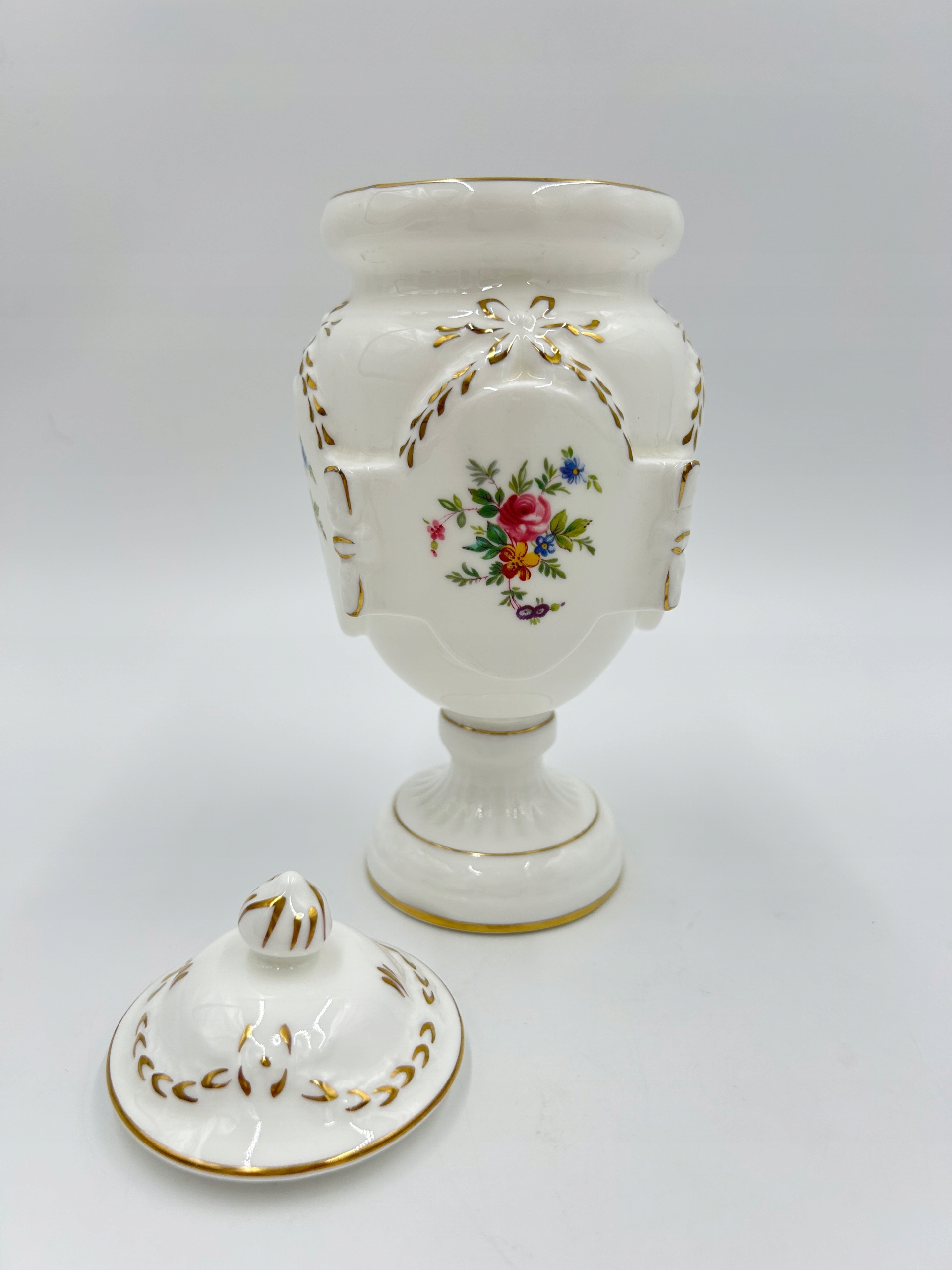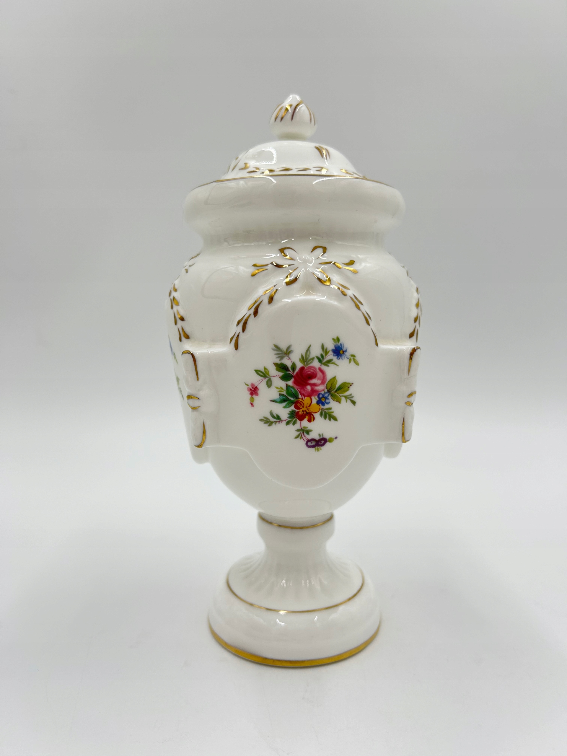 Предметом продажу є унікальна амфора з кришкою виробництва Мінтон. Виготовлена з ніжної білої порцеляни, прикрашена рельєфами та різнокольоровими квітами.