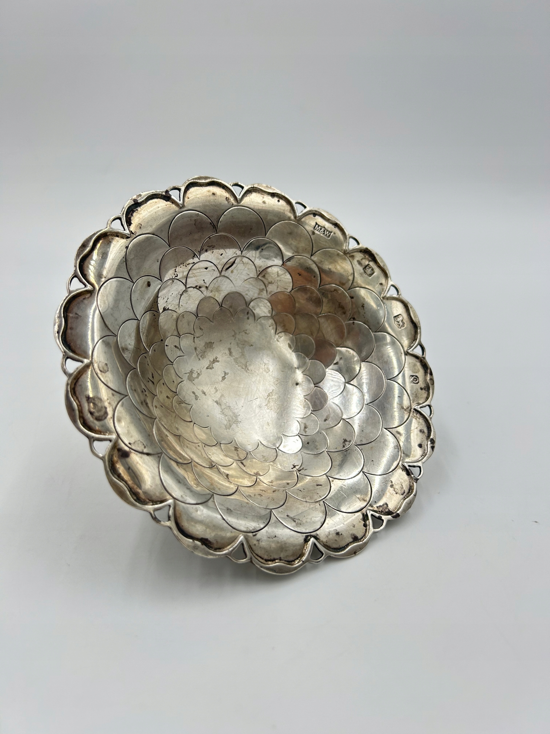 Предметом продажу є феноменальна підставка для торта - кошик округлої форми, на ніжці, прикрашена риб'ячою лускою. Срібло 925. Mappin & Webb, SHEFFIELD 1958. Рідкісний предмет. Рекомендую.