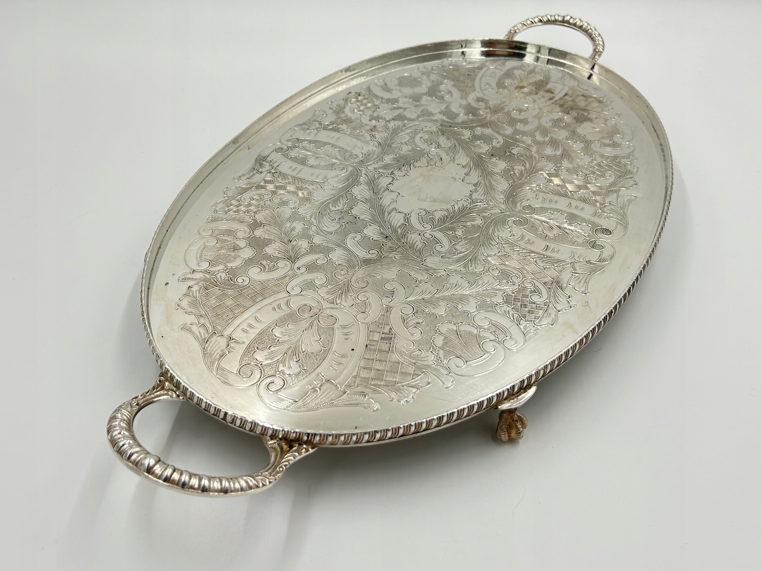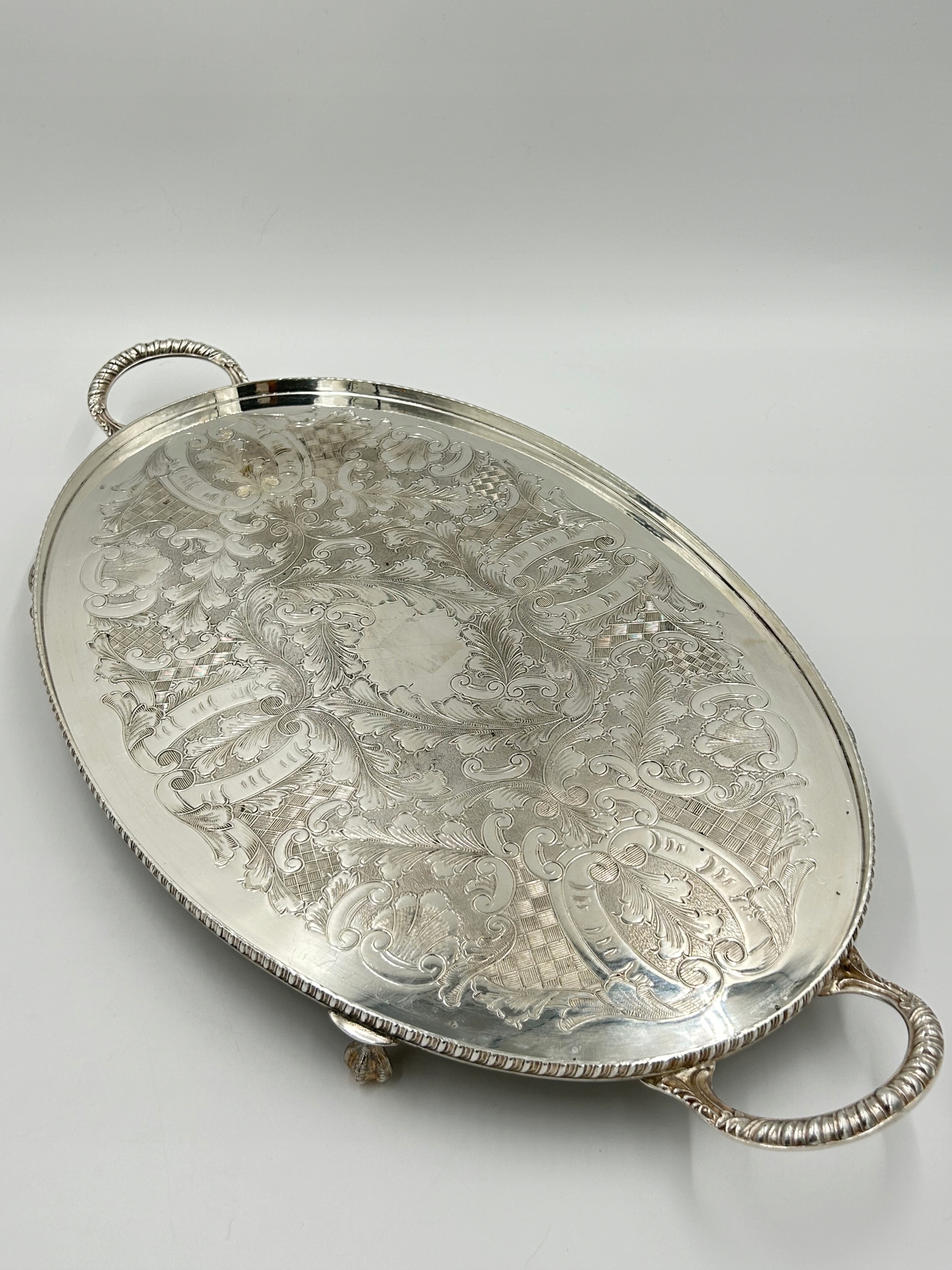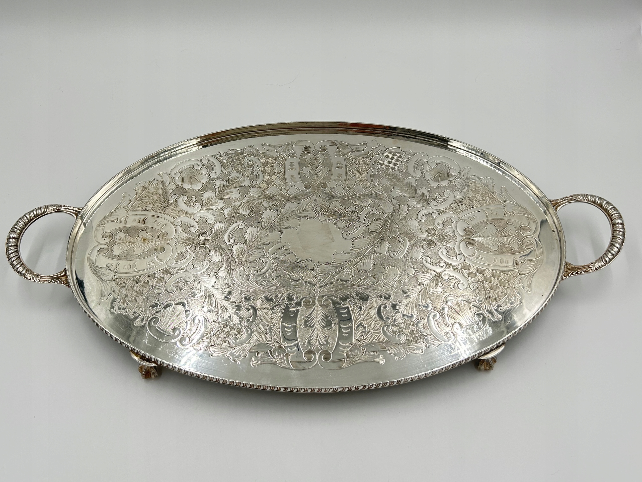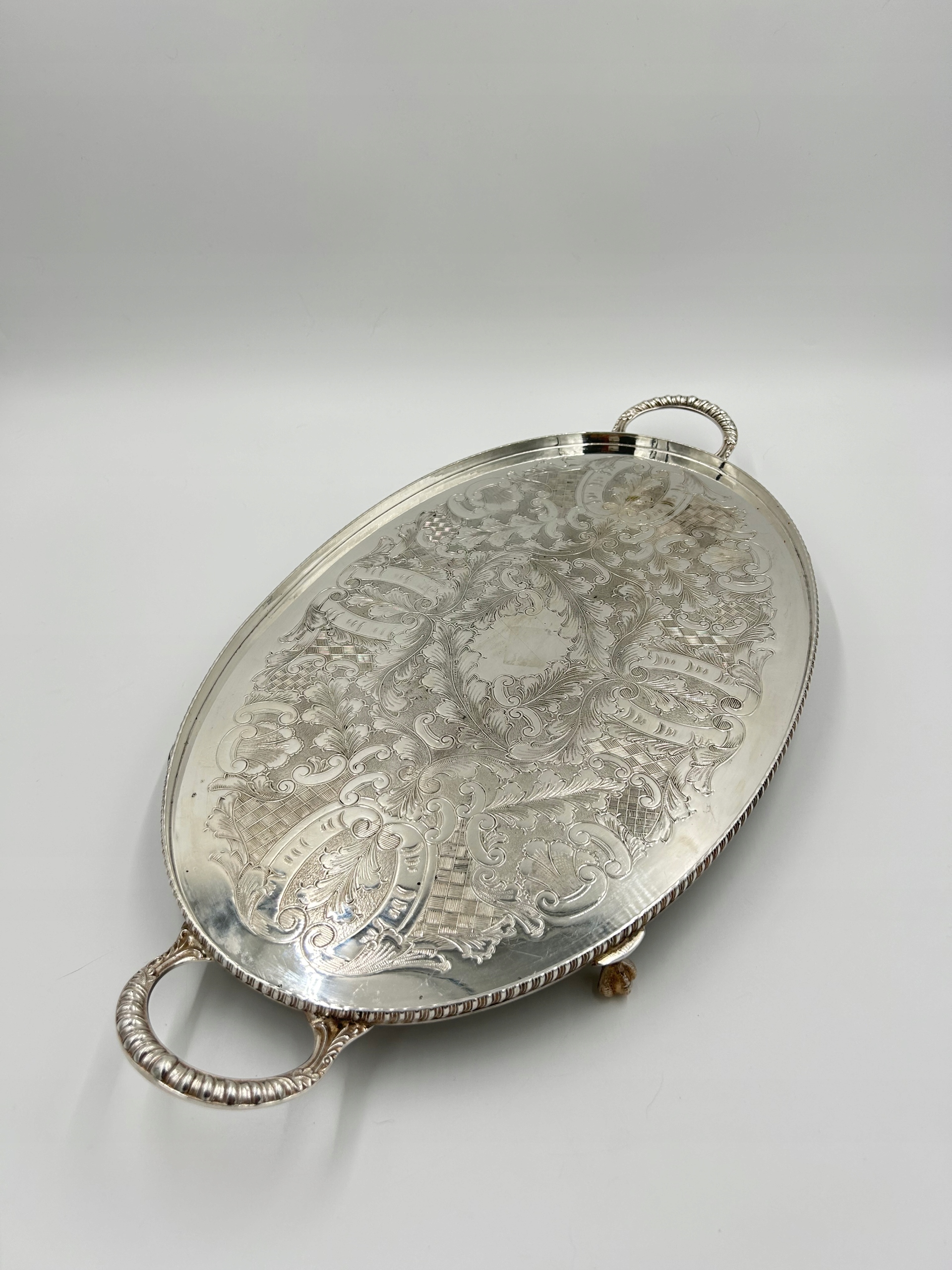 Предмет продажу - унікальне блюдо, таця з гарним декором. Блюдо овальної форми з декоративними ручками, встановлене на чотирьох витончено вигнутих ніжках. Підпис на зворотному боці таблички. Походження Англія.