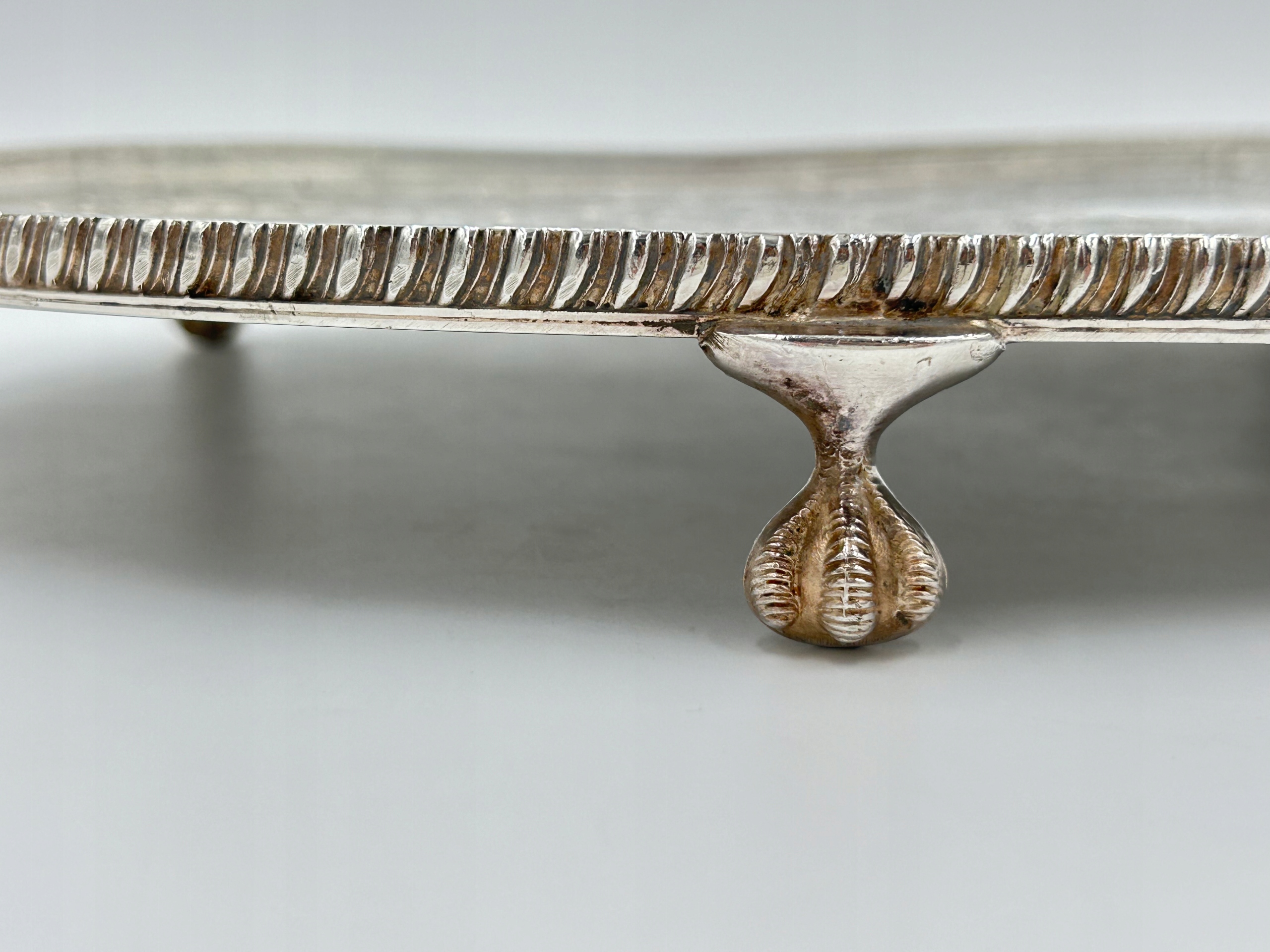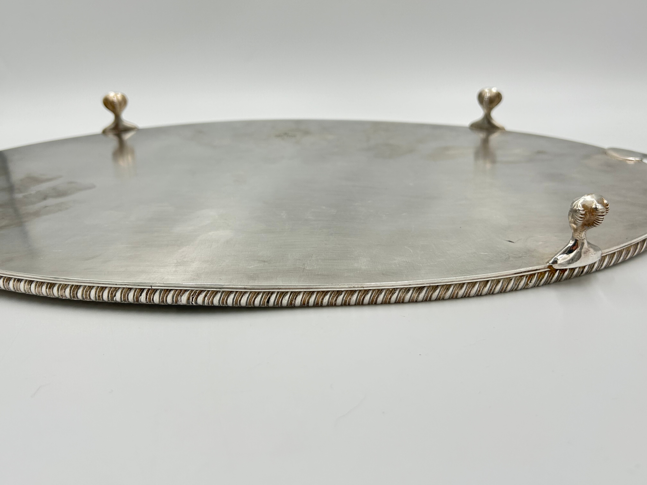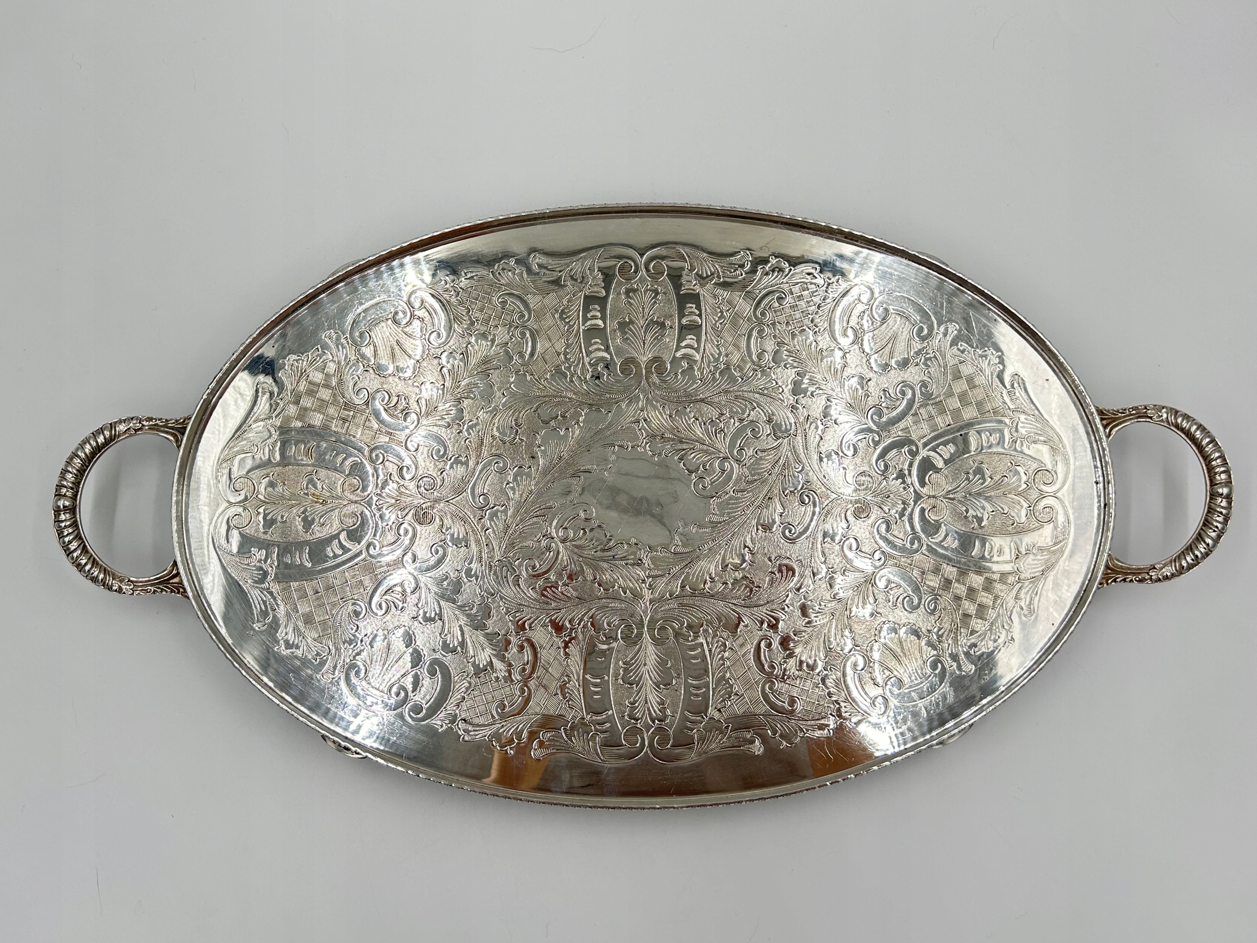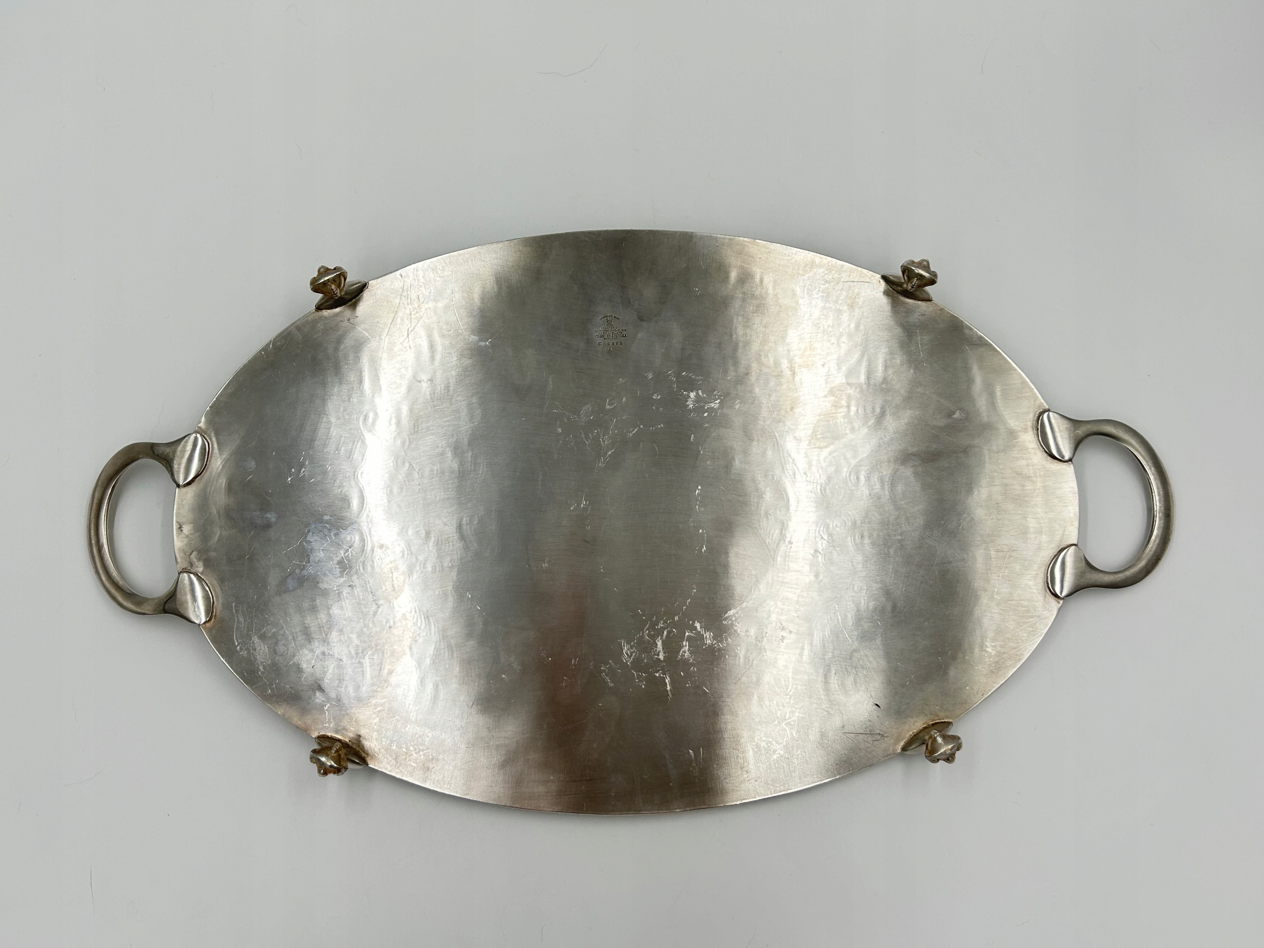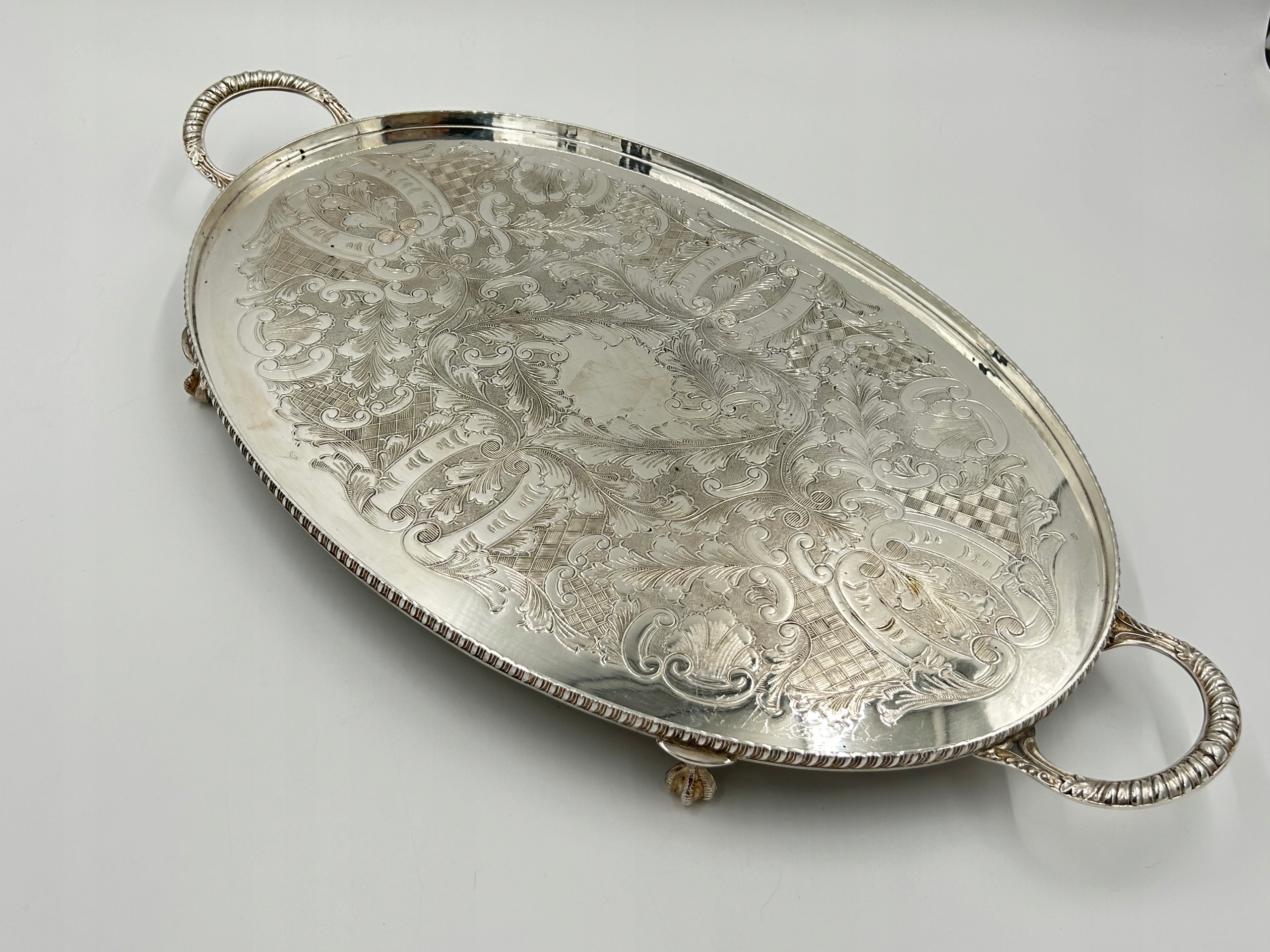 Предмет продажу - унікальне блюдо, таця з гарним декором. Блюдо овальної форми з декоративними ручками, встановлене на чотирьох витончено вигнутих ніжках. Підпис на зворотному боці таблички. Походження Англія.