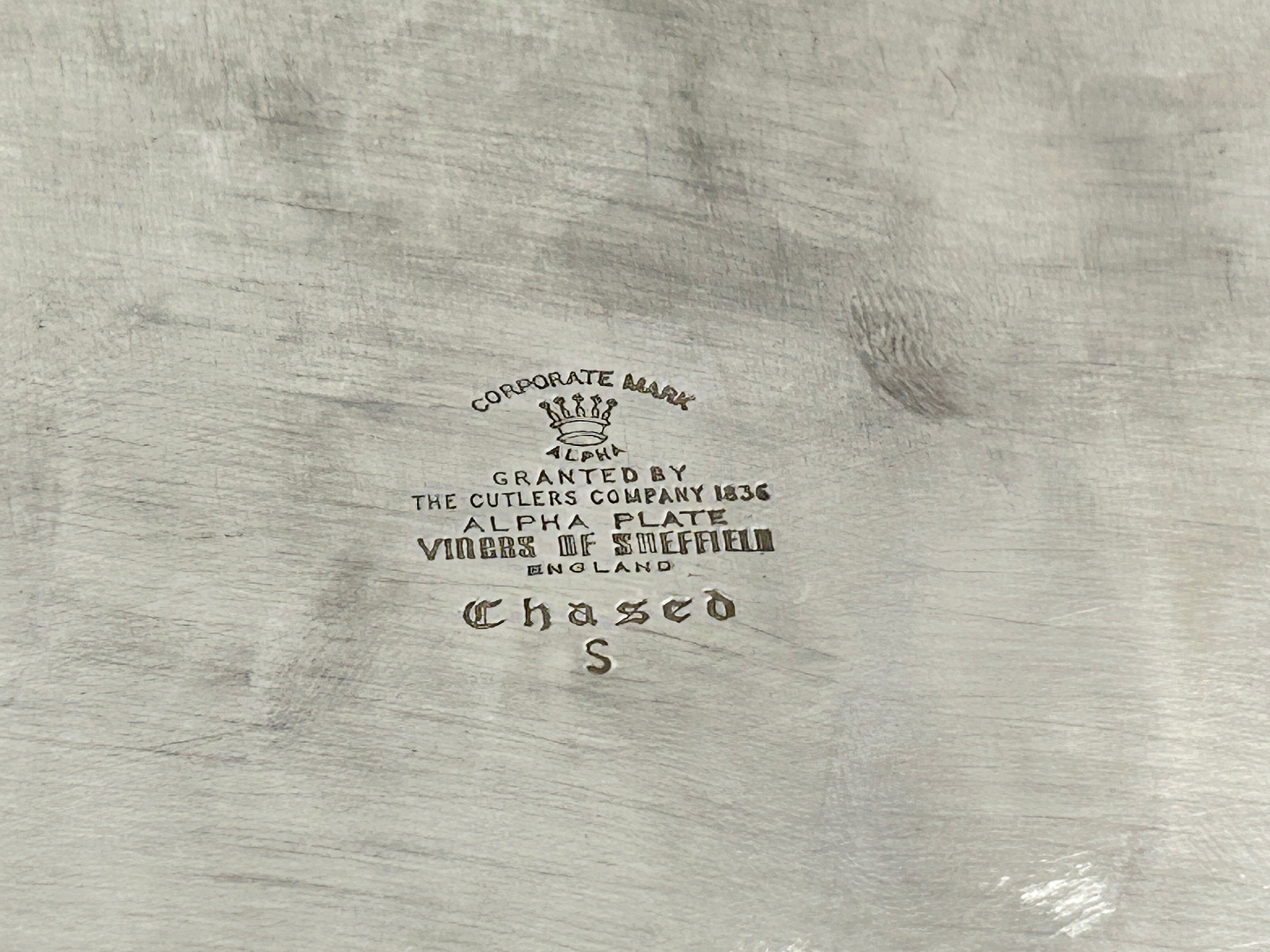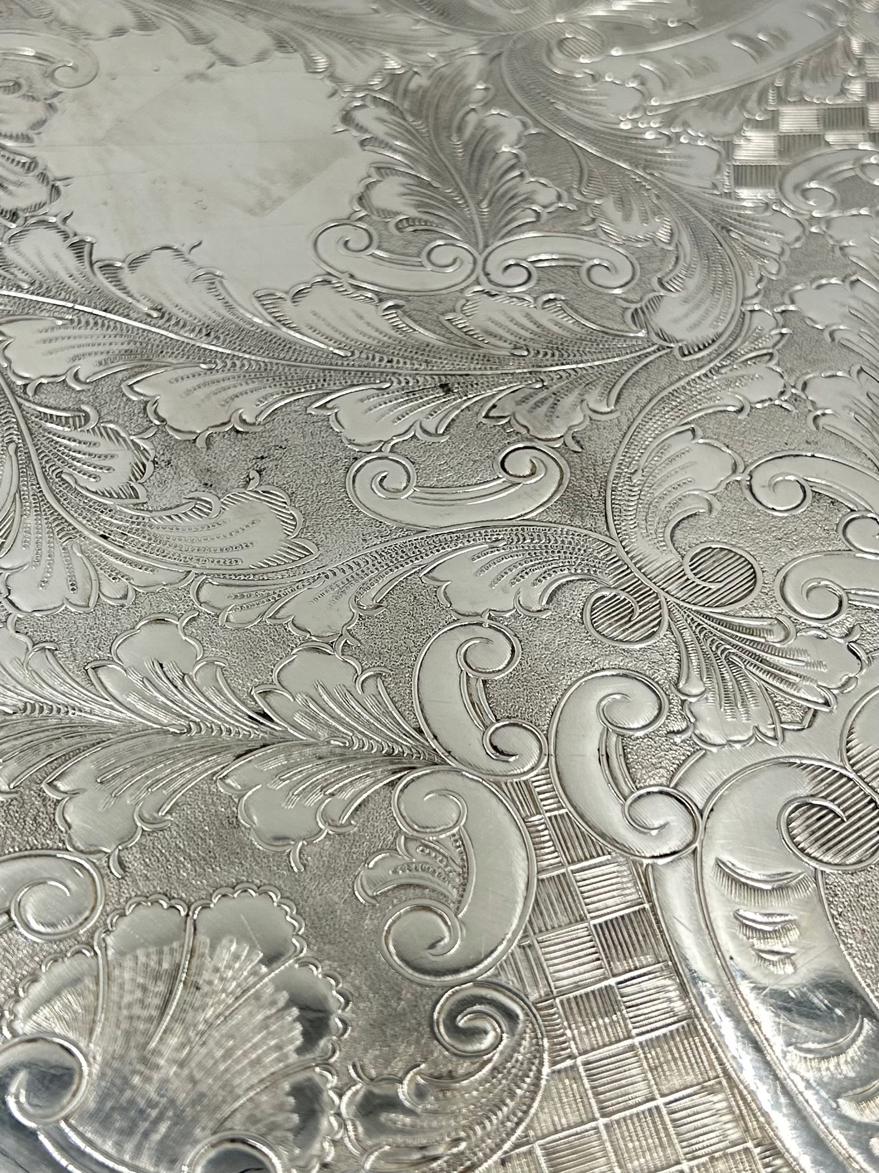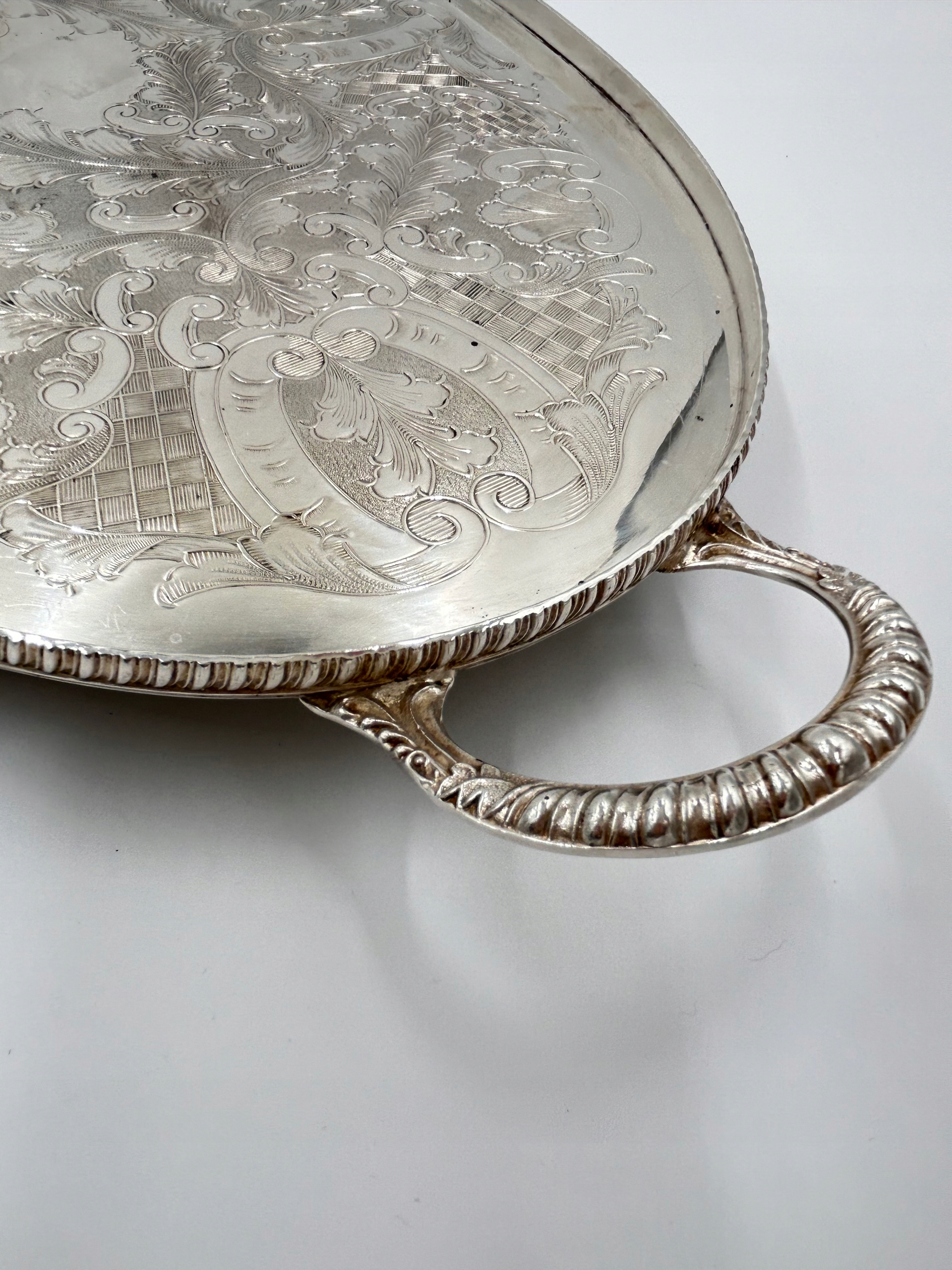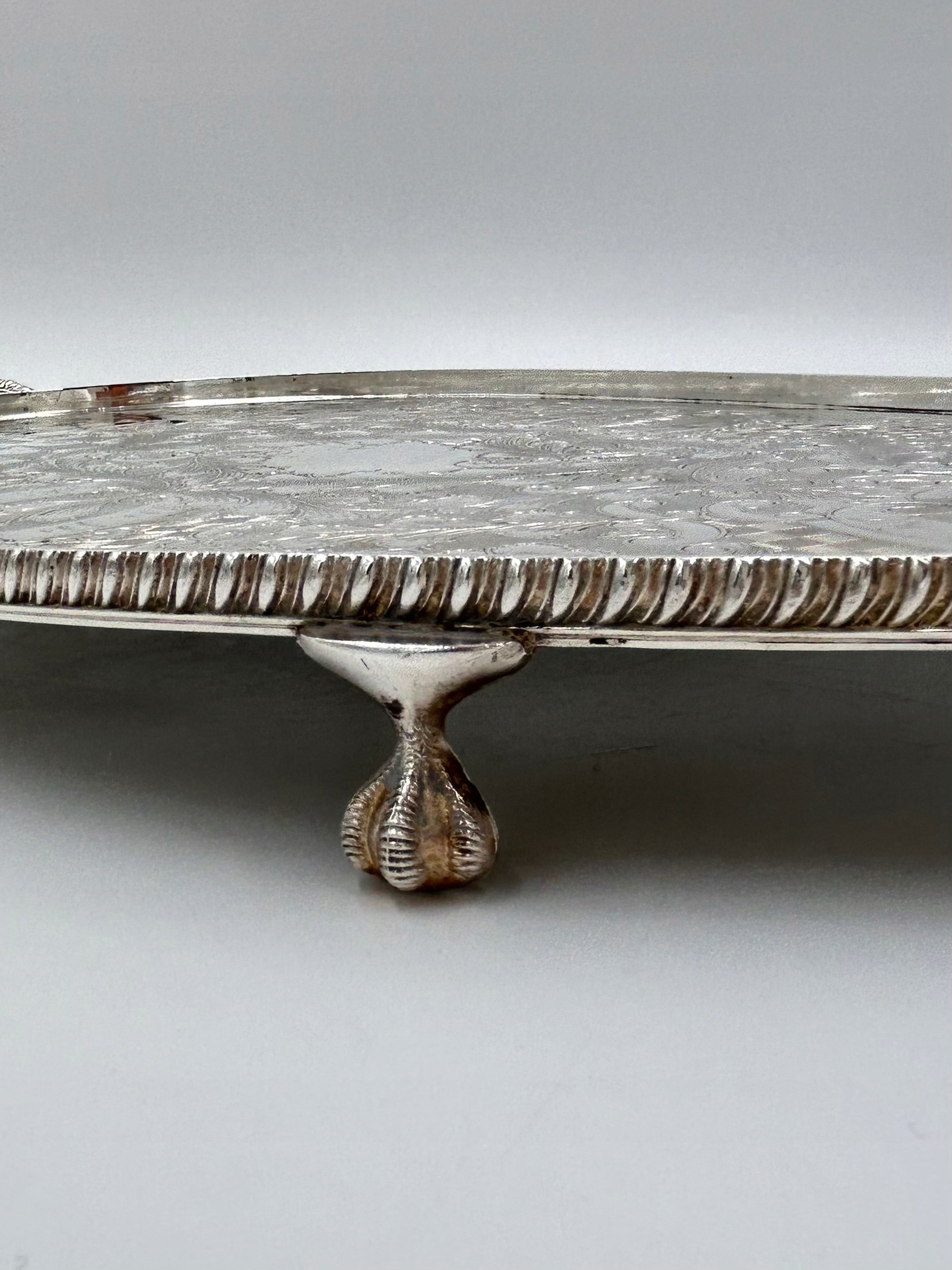 Предмет продажу - унікальне блюдо, таця з гарним декором. Блюдо овальної форми з декоративними ручками, встановлене на чотирьох витончено вигнутих ніжках. Підпис на зворотному боці таблички. Походження Англія.