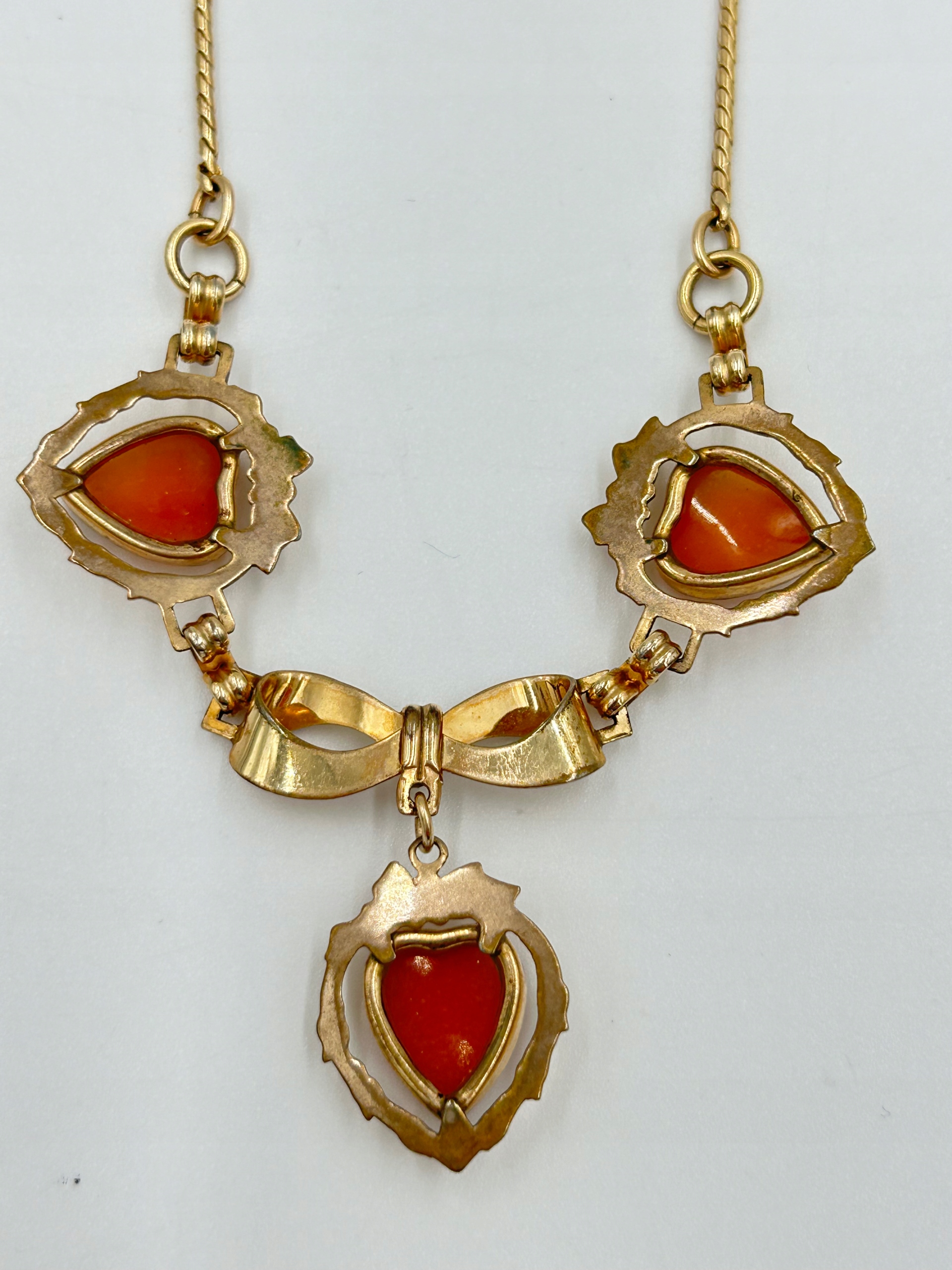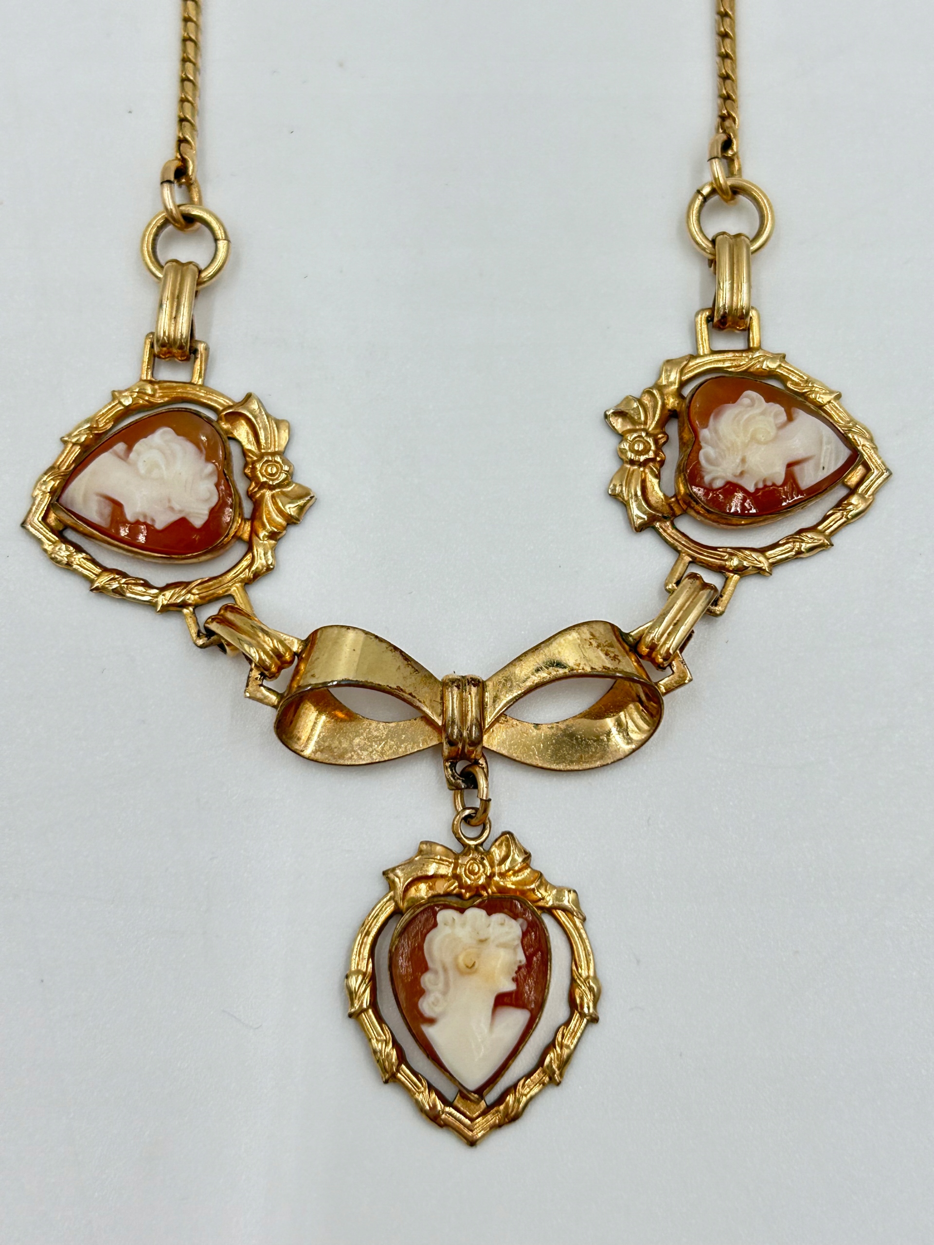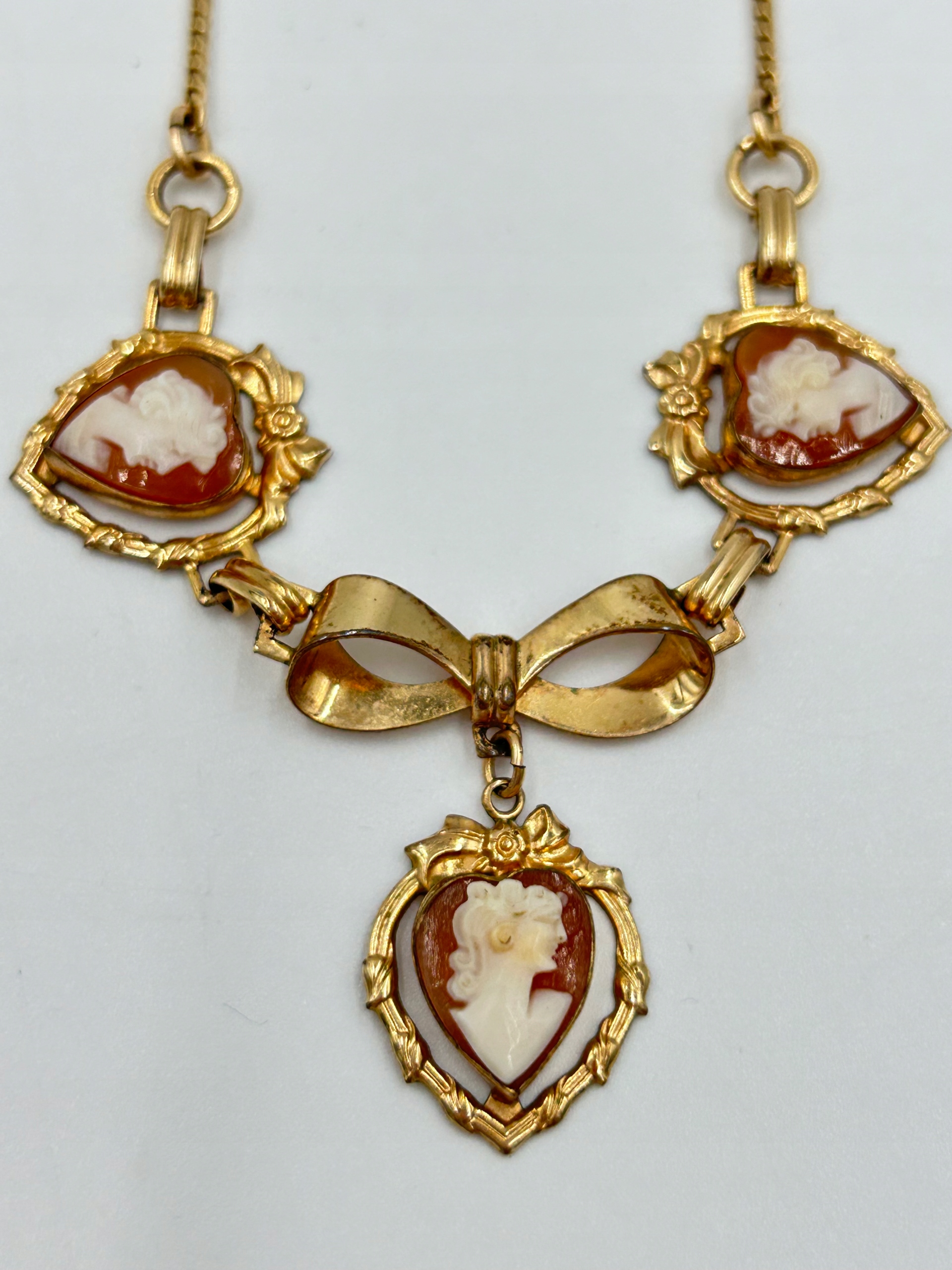 Тема продажу -це прекрасне намисто з потрійною камерою, виготовленою у вікторіанському стилі, прикрашеному камерою, укладеною серцем із профілем, що профілю молодої жінки. Метал.