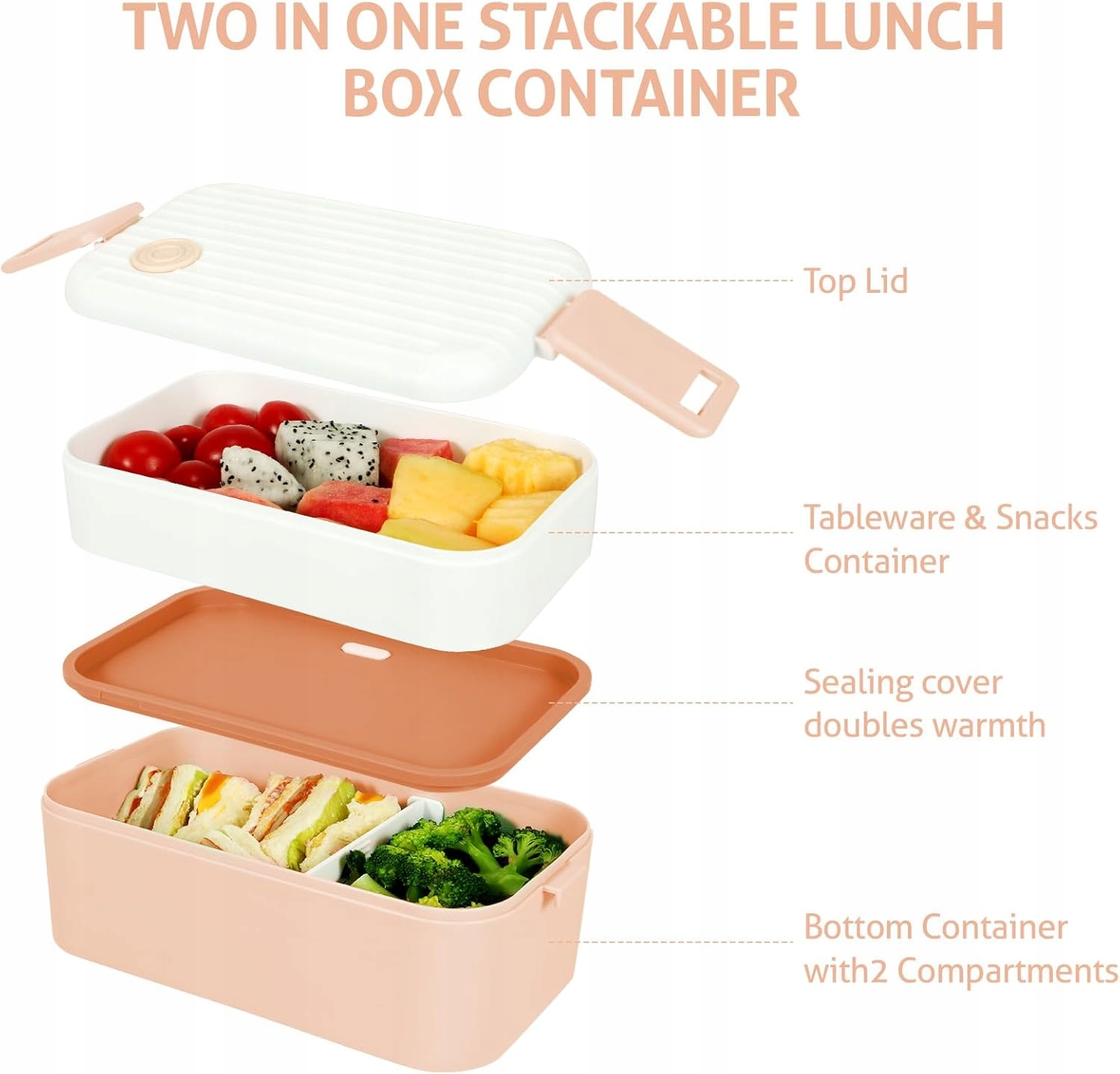 4 Екологічна коробка для багаторазового обіду. Поверхня ретельно відшліфована, кругла і гладка, вона не притягує руку. Їжу можна легко та вільно розділити: у наборі Bento Box є 2 контейнери, які можна розмістити один на одного, загальною ємністю 1800 мл. Всередині є два відсіки, які легко і вільно відокремлюють їжу, запобігають їжі та зберігають оригінальний смак їжі. Висувні відсіки для обіду в коробках дозволяють різноманітну збалансовану дієту, ідеальну для щоденних прийомів їжі або їжі з контрольованою порцією. Класична двошарова конструкція: 1 х маленька ложка, 1 х маленька вилка розташована в середній камері на обід і може зберігатися для економії місця. Легко відкрити і закрити пряжку ременя безпеки з обох боків, забезпечуючи безпечне підходження до коробки на обід. Класична двошарова конструкція ідеально підходить для невеликих рюкзаків. Ви можете принести фрукти, закуски та інші частування. Він не підходить для зберігання рідин. Ви можете використовувати в мікрохвильовій печі та промиватися в посудомийній машині: коробка для другого сніданку для дітей з відділеннями виготовляється з екологічно чистих матеріалів, підходить для мікрохвильової піч (2-4 хвилини при 248 ° F), морозильної камери (≧ -4 ° F) та посудомийної машини (примітка: не кладіть у закладку та середню композицію в мікрохвилі або посуді середнього композиції). Для чищення рекомендується використовувати гарячу воду. Обідня коробка - це ідеальний вибір для дорослих та дітей, не тільки для студентів, він також підходить для обіду в офісі, наш контейнер для приготування їжі - ідеальний супутник.