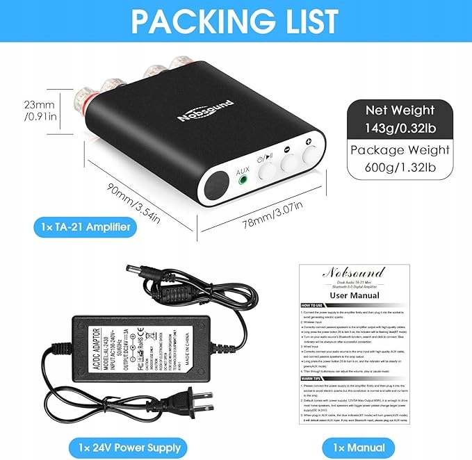 Nobsound TA-21-це ультракомпактний, стерео цифровий підсилювач з Bluetooth 5.0 та DSP (цифрова обробка сигналів), що пропонує потужну вихідну потужність до 200 Вт (100 Вт на канал). Працюючи від напруги від 9 В до 24 В постійного струму, використовується вдосконалена мікросхема TPA3221, яка перевищує старі моделі TPA3116 з точки зору потужності, ефективності та низького випромінювання тепла - навіть при русі великих динаміків підлоги. �
