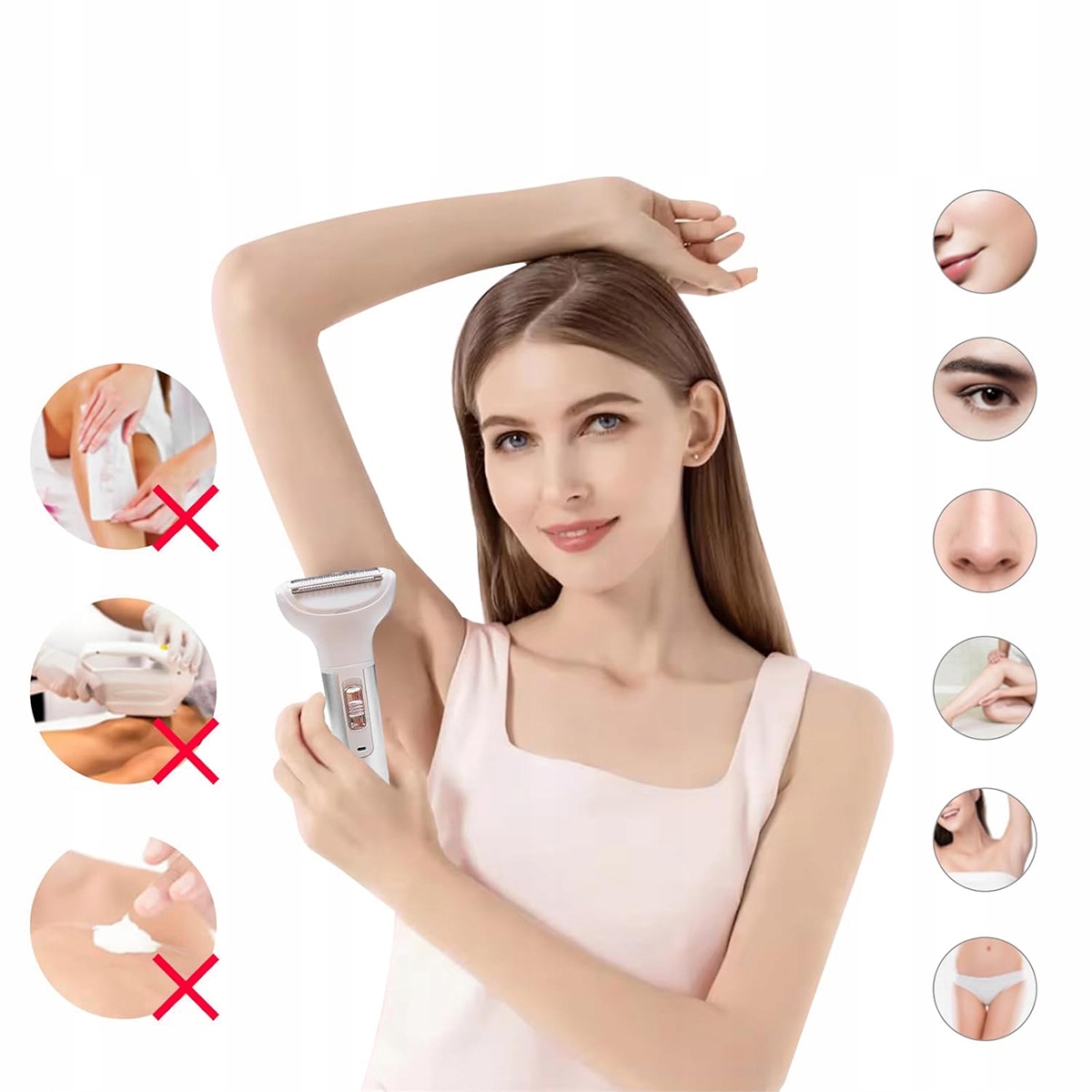 5 в 1 комплект електричного гоління містить 5 багатофункціональних голов, які можуть негайно зняти волосся з обличчя, руки, ноги, лінія бікіні, ніс, брови, рот тощо, залишаючи шкіру плавнішою.