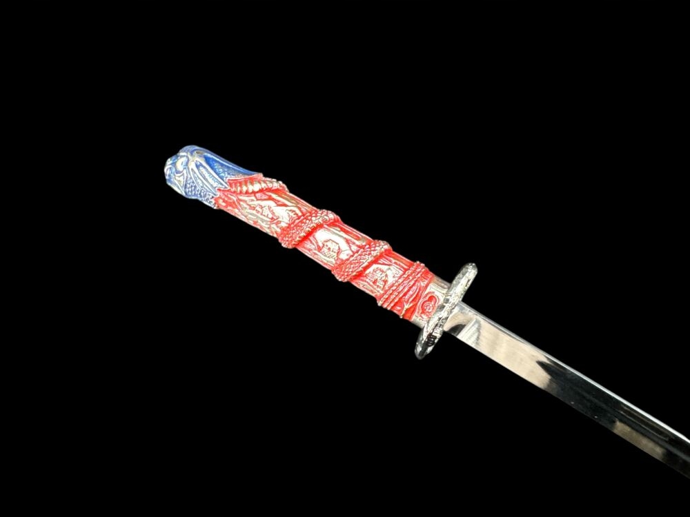 ❇aets частина цього унікального маленького меча була зроблена з надзвичайною точністю та увагою до деталей. Лезо з нержавіючої сталі прикрашається з обох боків, представляючи багаті гравюри, пов’язані з історією та традицією. Ручка, виготовлена з металу, не тільки красива, але й зручна на дотик. Багатий оформлена голова та Джелек додають величний вигляд, що робить його справжнім творчим мистецтвом мистецтва.